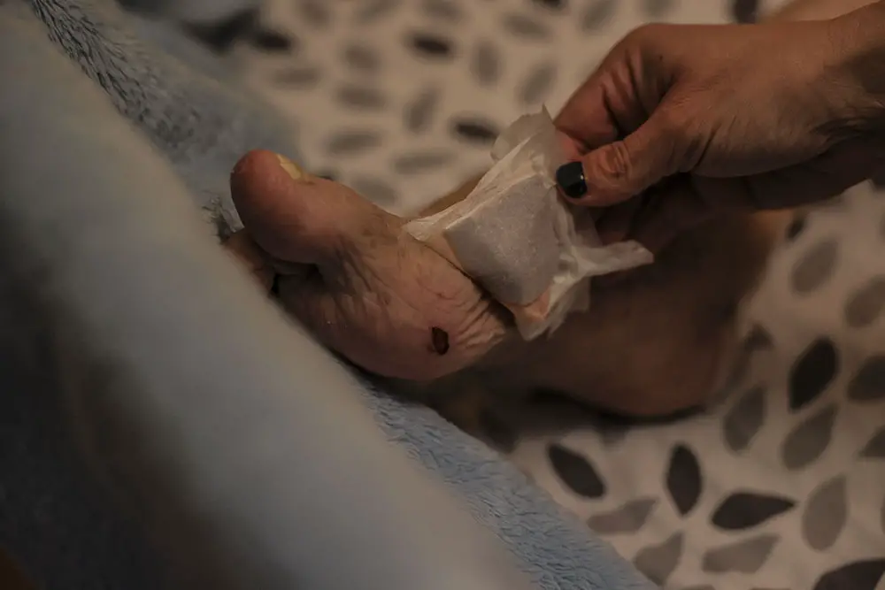 80-latek do domu wrócił w dniu, 5 stycznia, br. – To był przerażający widok. Tata nie mówił tylko cierpiał przez potworne odleżyny. Nic nie mówi tylko strasznie cierpi – mówi A. Madoń. Krwawiące rany pojawiły się na nogach mężczyzny, szczególnie na stopach i kolanach. Największa odleżyna jest na kości ogonowej. – To przerażające. Jest tak duża, że do środka można włożycć dłoń – mówi A. Madoń. Mężczyzna do dnia powrotu ze szpitala jest na silnych lekarz przeciwbólowych.