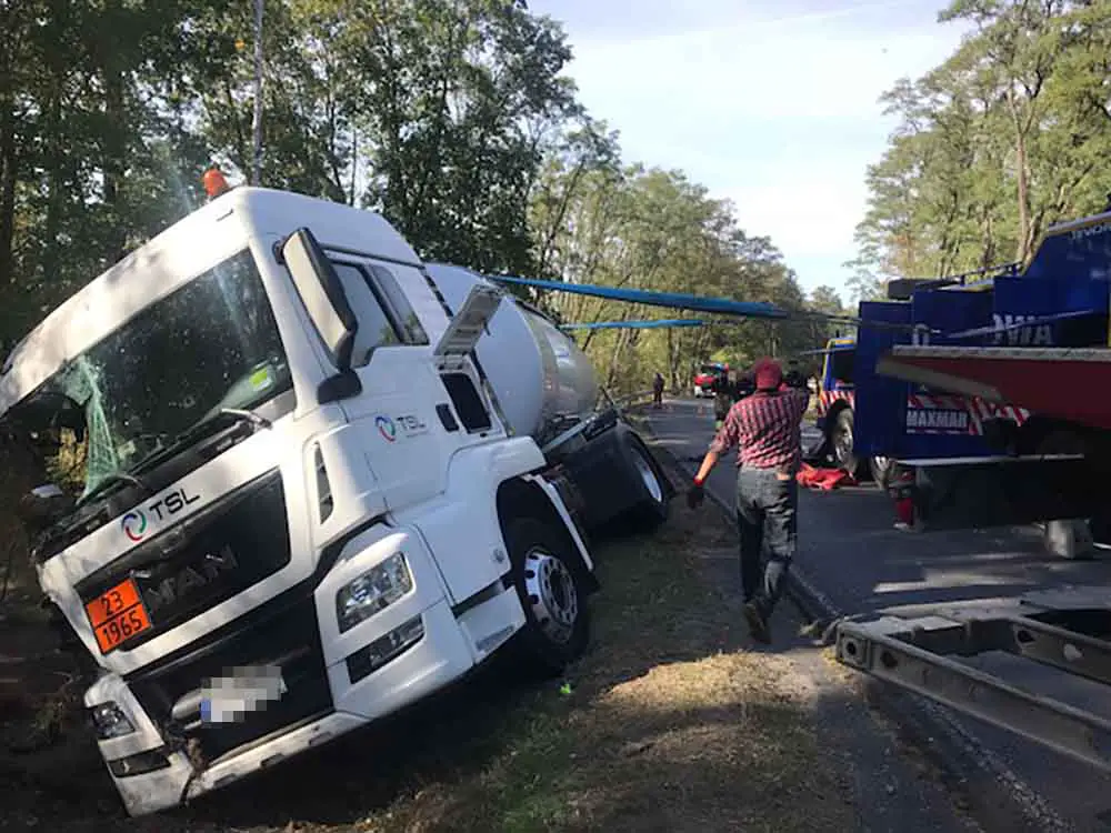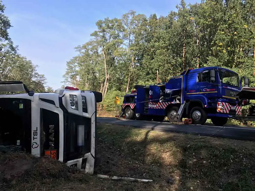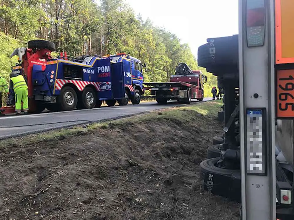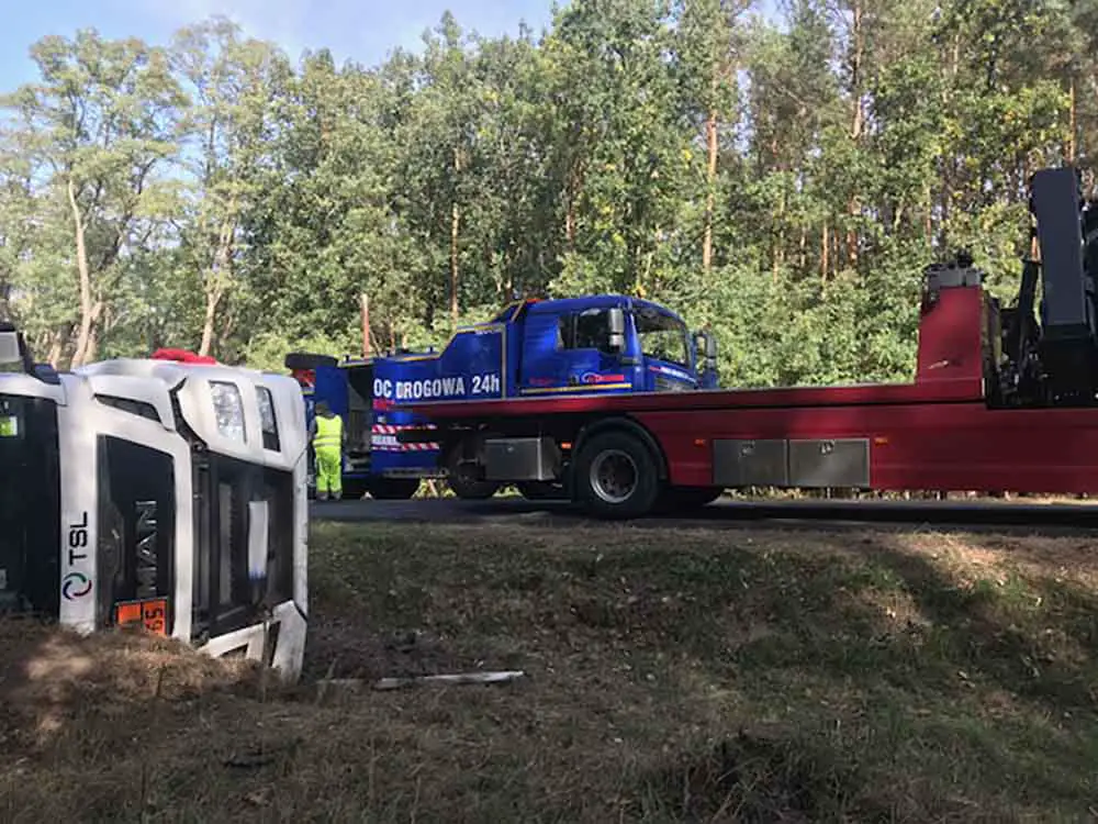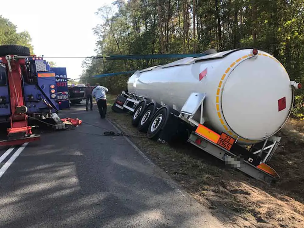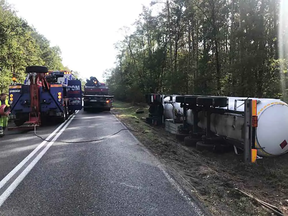 Ciężarówkę trzeba było podnieść z pobocza i postawić na koła. – Zadanie było trudne, bo ciężarówka była wypełniona gazem. W sumie ważyła ponad 40 ton – mówi Marek Dziubałka z pomocy drogowej Maxmar. Nie było mowy o przepompowaniu zawartości.