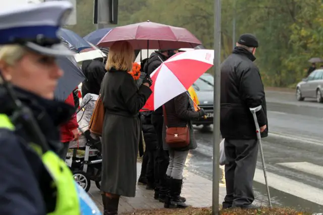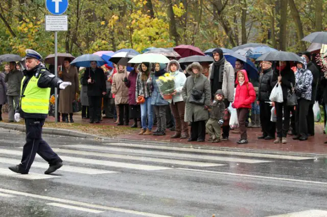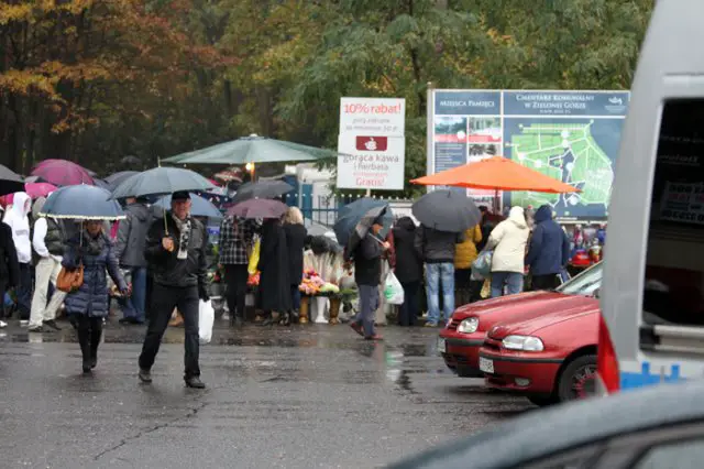 Godz. 10.15 – ruch przy cmentarzu robi się coraz większy, do tego pada deszcz. Policjanci kolejny raz apelują do kierowców, aby ci zwracali uwagę na sygnały od policjantów regulujących ruchem. Zapełniają się parkingi koło nowego cmentarza i na pętli MZK. W kierunku ul. Wrocławskiej z miasta ciągnie się długi sznur samochodów i autobusów. Samochody nieprzerwanie jadą również w kierunku miasta z cmentarza.