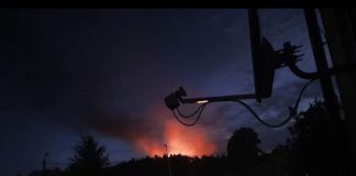 Nocny pożar budynków po przystani w Dychowie i lasu