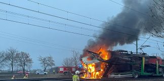 Wypadek. Pociąg uderzył w lawetę. Doszło do wybuchu, samochód zapalił się...