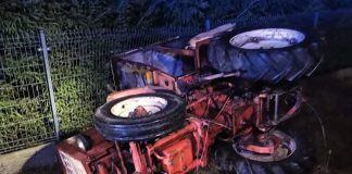 Ciągnik wpadł do rowu i przewrócił się. Kierowca upity do nieprzytomności....