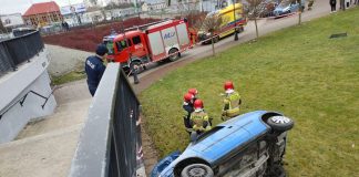 Wypadek. Pijany kierowca oplem przebił barierki i spadł ze schodów (ZDJĘCIA)