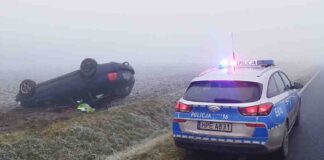 Dachowanie osobówki. Kierowca we mgle nie zauważył zakrętu