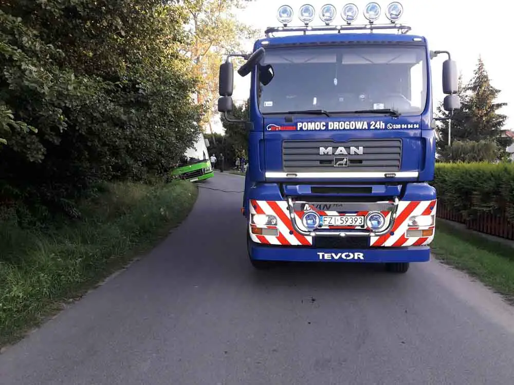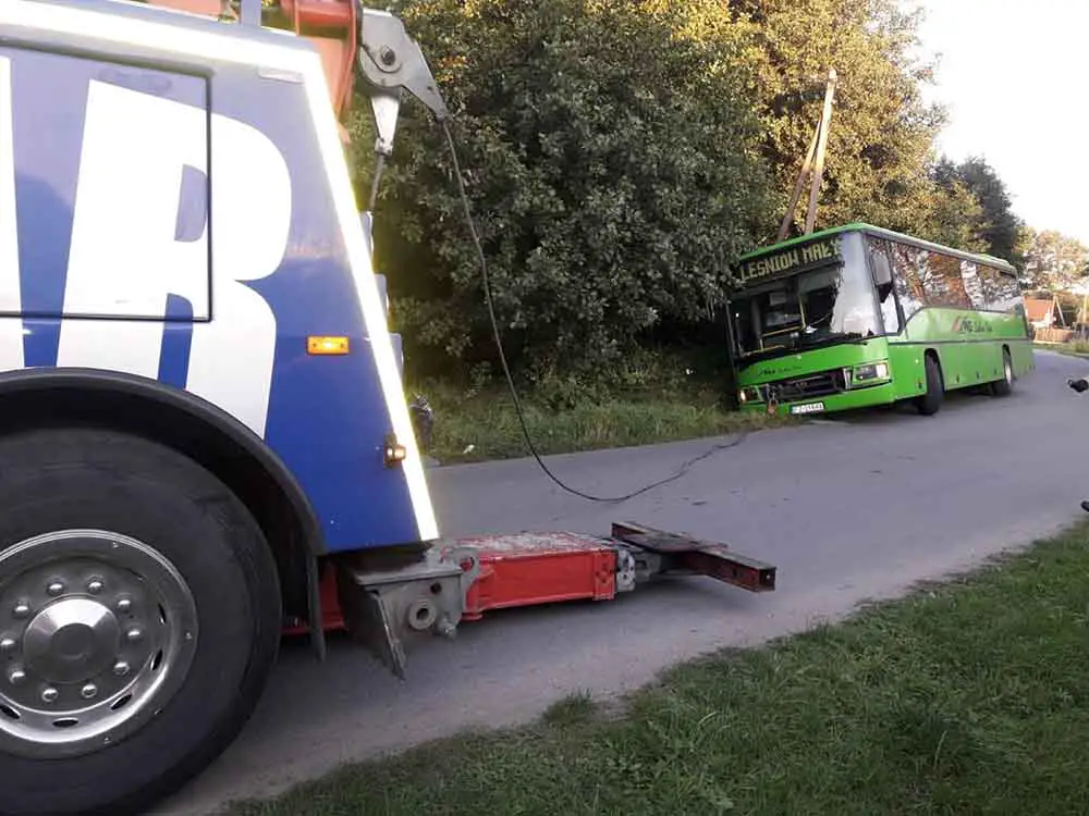 Kierujący autobusem PKS wpadł w poślizg. Pojazd wypadł z drogi i uderzył w słup wysokiego napięcia. Na szczęście nikomu nic się nie stało. Uszkodzony autobus z pobocza wciągnęła pomoc drogowa Maxmar.