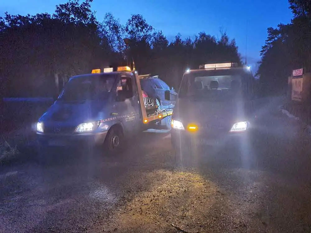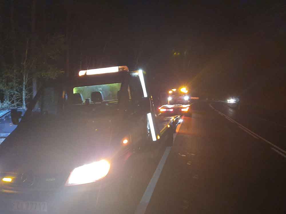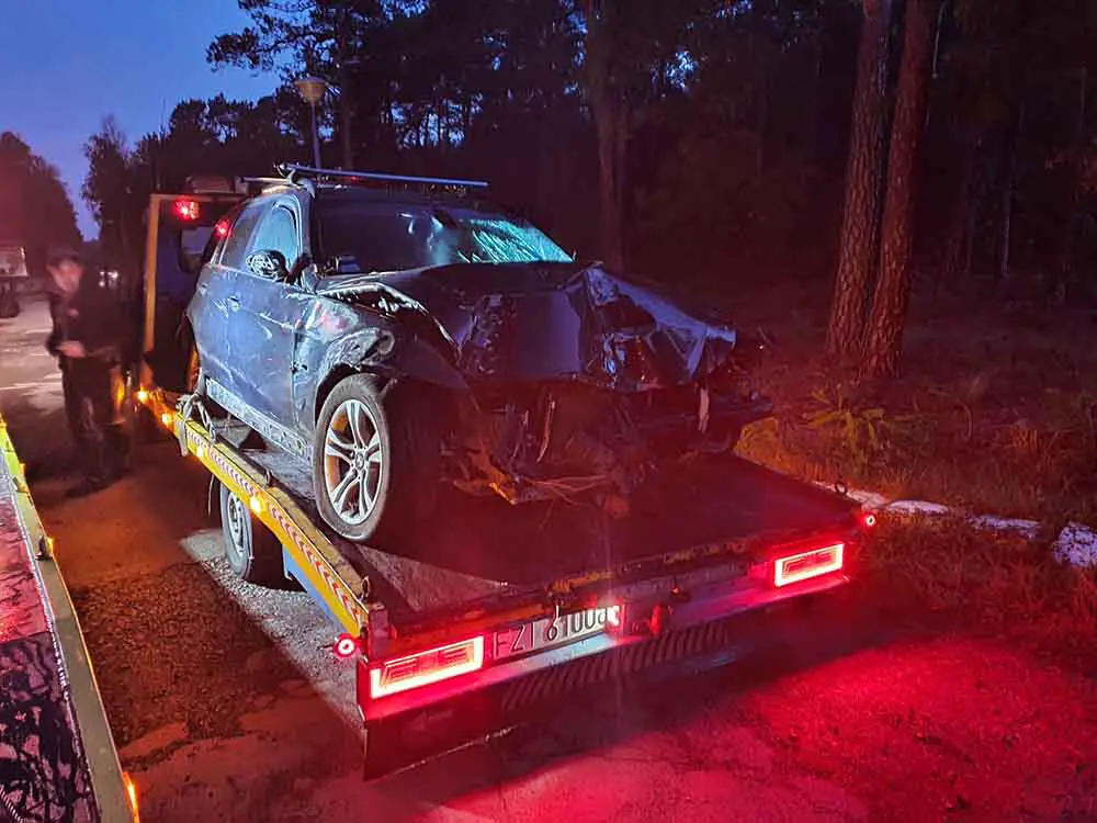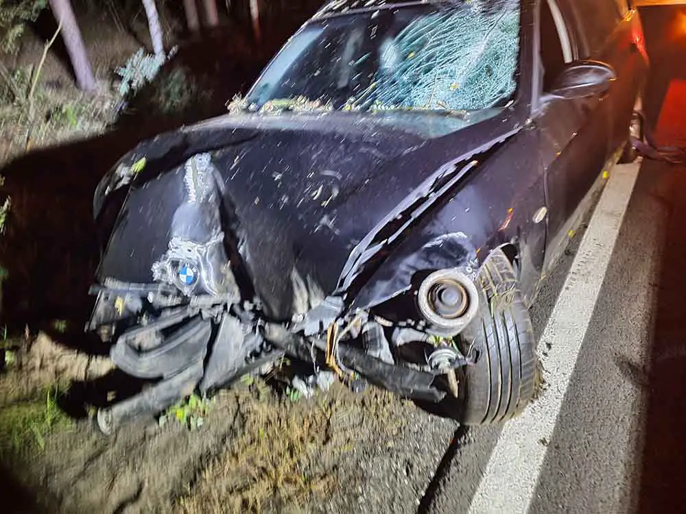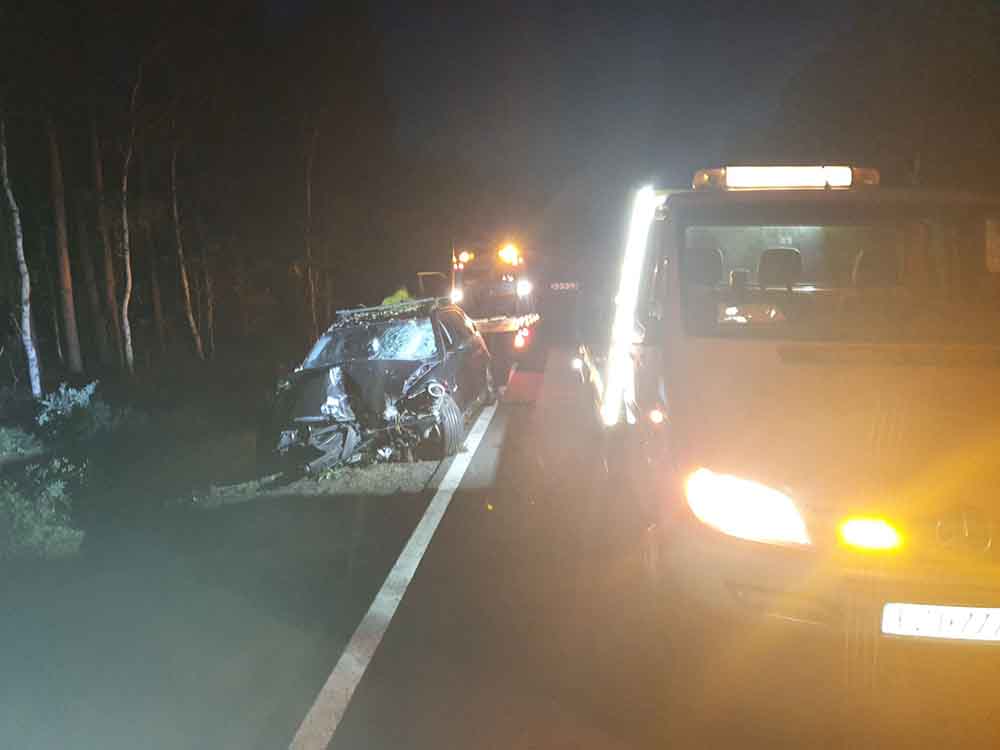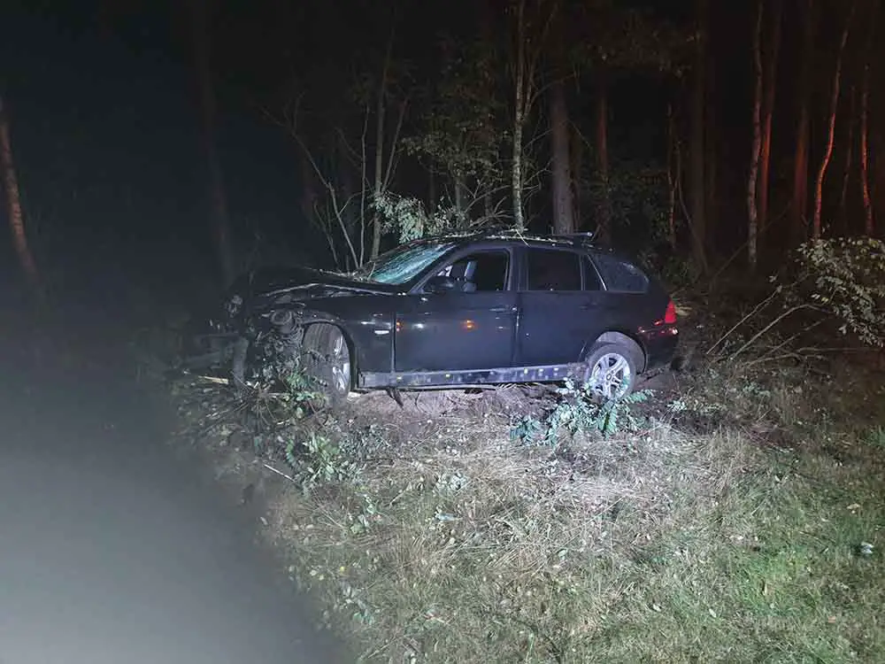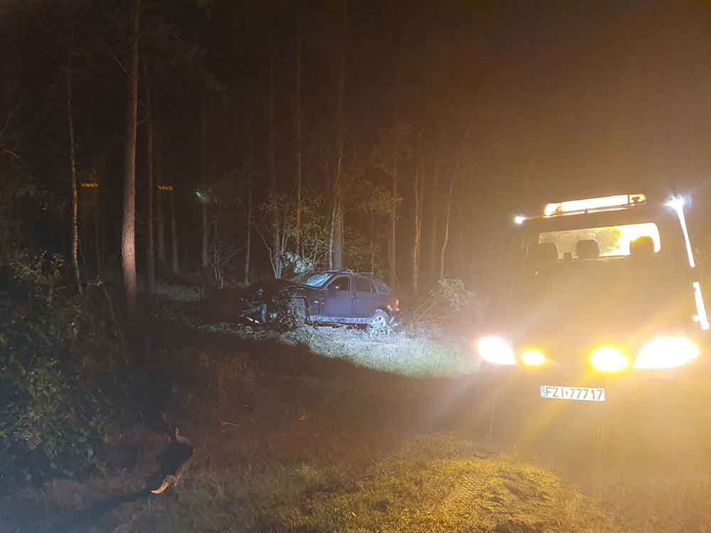 Kierujący bmw jechał w kierunku Zielonej Góry. Na niebezpiecznych zakrętach za Nowogrodem Bobrzańskim rozpędzone bmw wypadło z drogi. Samochód z dużą siłą uderzył w drzewa łamiąc je. Przód auta został kompletnie rozbity. Siła uderzenia była tak duża, że w bmw zostały oderwane koła. Kierowca mówił, że na drogę wybiegło mu leśne zwierzę. Chcąc uniknąć potrącenie zwierzęcia wypadł z drogi.