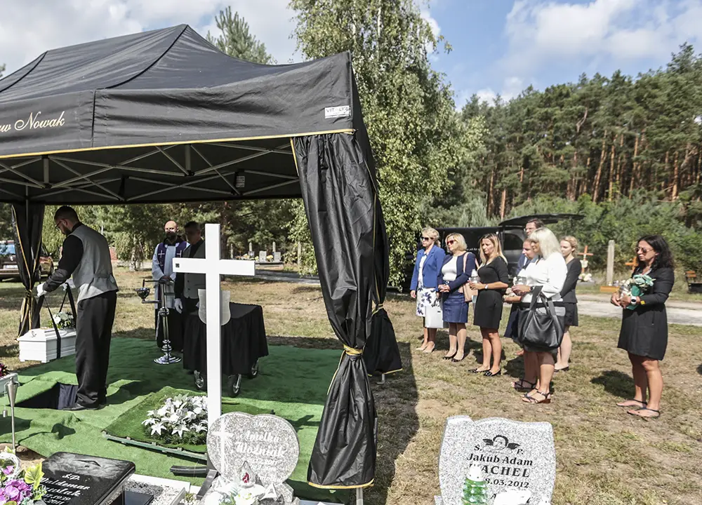 Ceremonia pogrzebowa była skromna, ale gustowna. Dwa małe wieńce stały przy trumience. Odbyła się krótka msza w kaplicy przedpogrzebowej. Jasia do grobu odprowadzono przy dźwiękach trąbki. W ciszy i smutku. Na maleńkiej białej trumience widać było napis Chłopczyk Jasiu. Noworodek na zawsze spoczął w małym grobie.