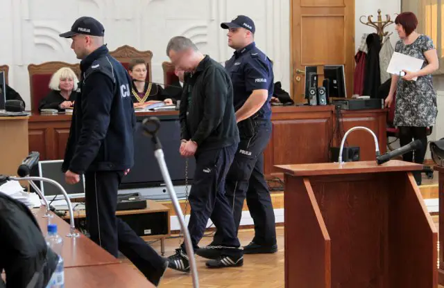Jerzy w kajdankach, z nogami zakutymi w łańcuchy, w czwartek 23 kwietnia został wprowadzony na salę rozpraw zielonogórskiego sądu. Siadł w ławie oskarżonych. Wyraźnie przytył od czasu zatrzymania na początku stycznia ub.r. W ławie oskarżonych, w asyście dwóch policjantów, został rozkuty z kajdanek. Odmówił składania wyjaśnień, ale odpowiadał na pytania sądu, prokuratora i oskarżyciela posiłkowego.