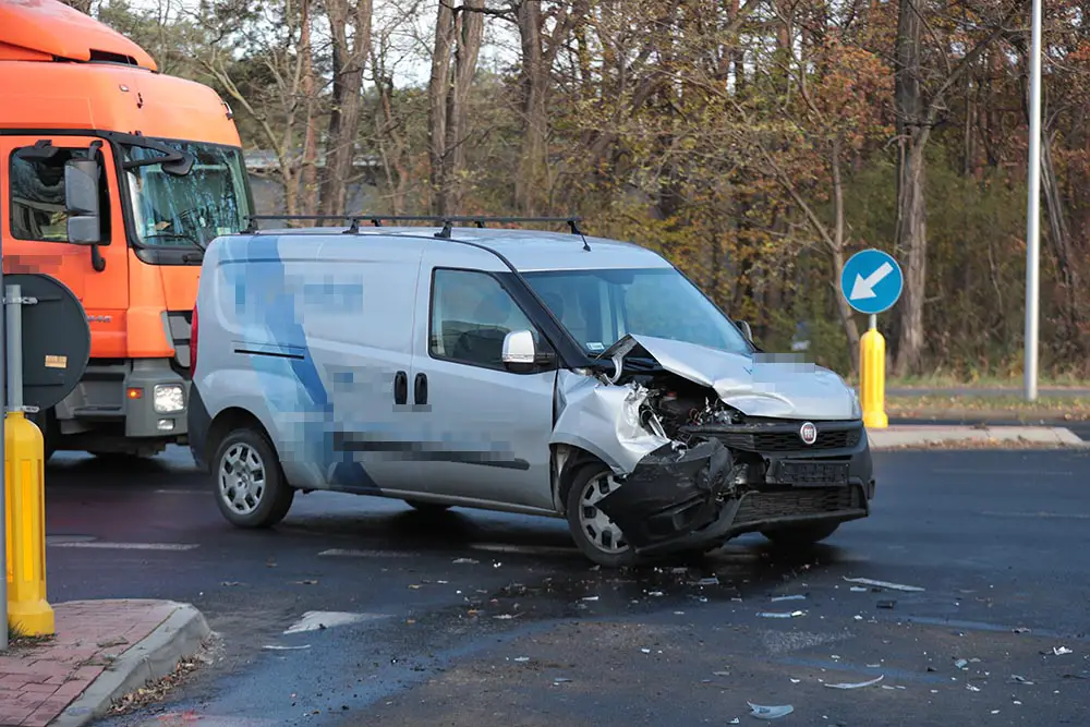Kierujący busem firmy kurierskiej jechał ul. Zjednoczenia. Skręcał w ul. Naftową. Wtedy wjechał pod fiata jadącego w kierunku miasta. Doszło do mocnego zderzenia.