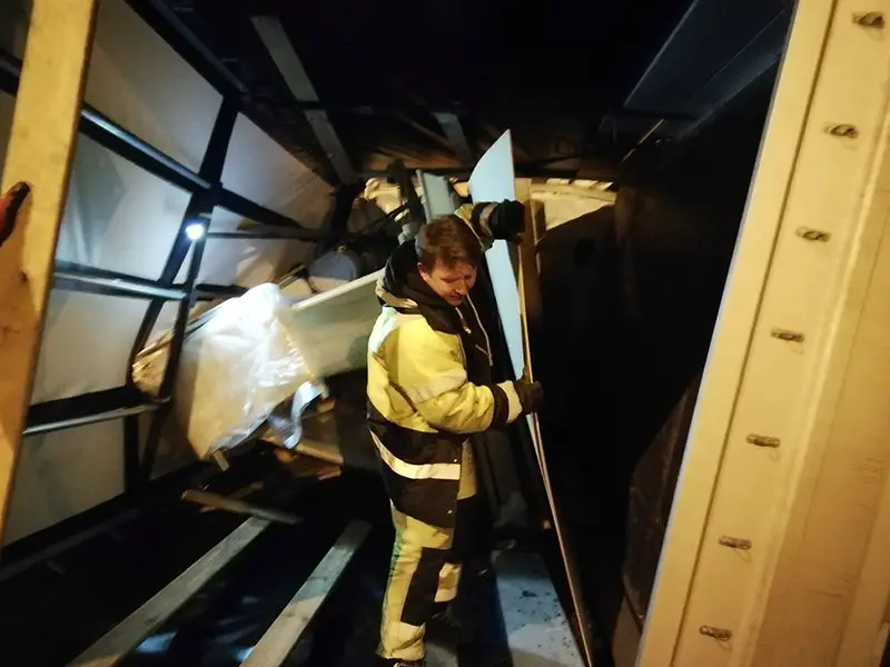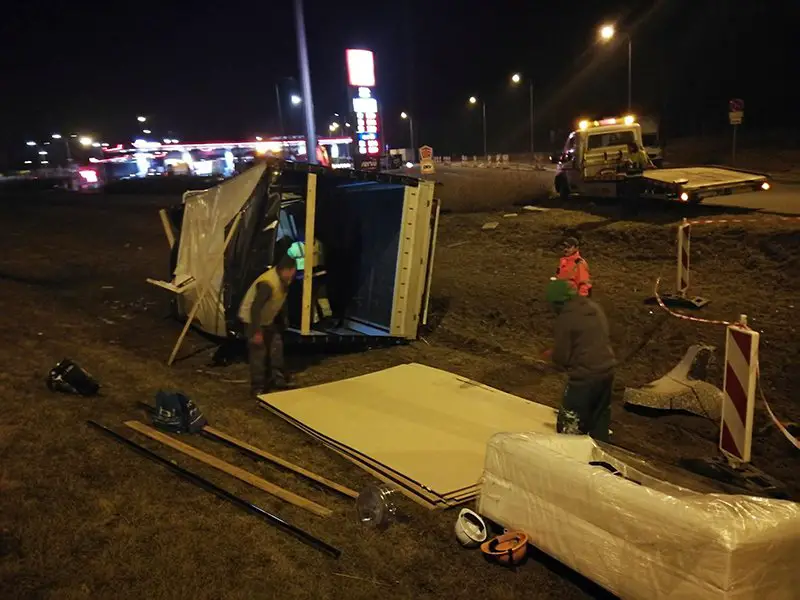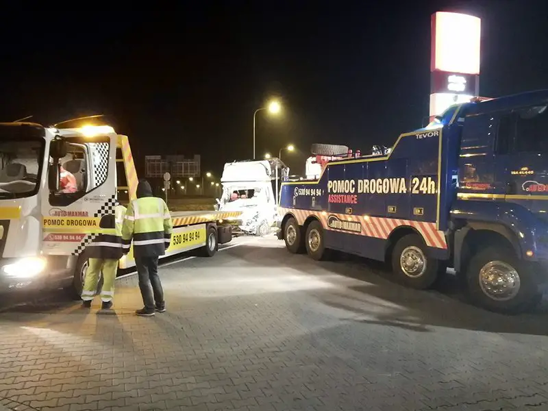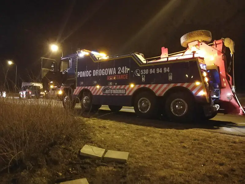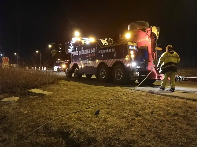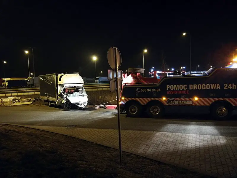 Samochód był podnoszony z pobocza późną nocą. – Bus został bardzo mocno rozbity. Przed wyciągnięciem na pobocze musiał zostać rozładowany – mówi Marek Dziubałka z pomocy drogowej Maxmar w Zielonej Górze.