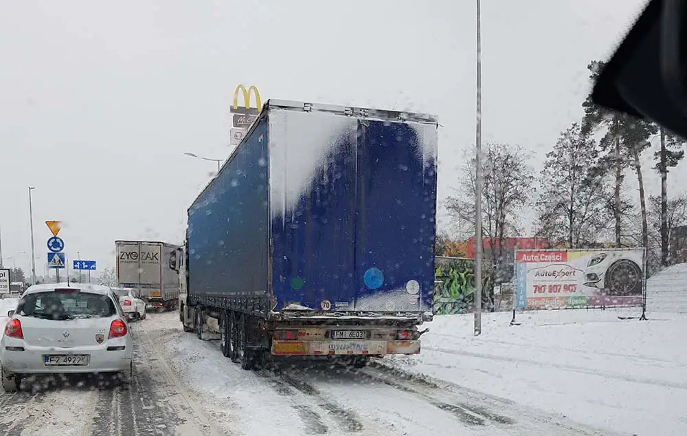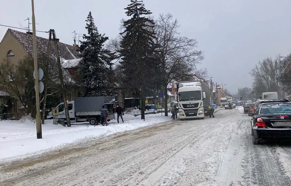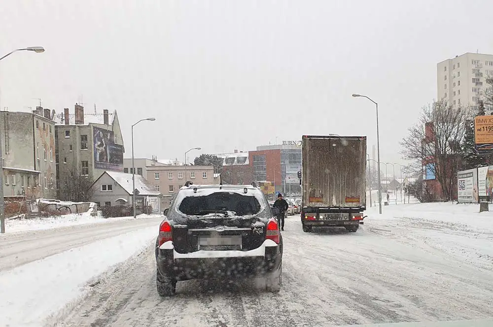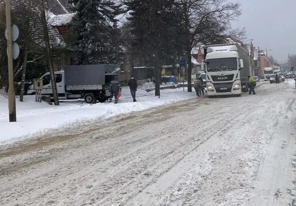 W poniedziałek, 8 lutego, od samego rana pada śnieg. Najpoważniejsze problemy w mieście mają kierowcy samochodów ciężarowych. Na drogach są korki.