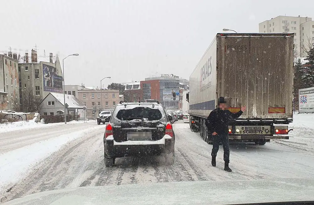 Z powodu oblodzenia dróg kierowcy ciężarówkę nie mogą wjechać nawet pod niewielkie wzniesienia w mieście.