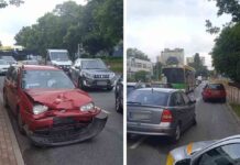 Zderzenie samochodów w centrum. Skoda wpadła na barierki (ZDJĘCIE CZYTELNIKA)