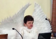 Radna Szymkowiak w stroju anioła z kiszonymi ogórkami. – PiS robi szopkę na sesji...
