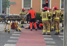 Wypadek w centrum Zielonej Góry. Zderzenie motocyklisty z mercedesem. Na miejscu służby ratunkowe (FILM,...