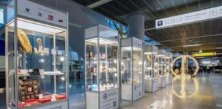 Pamiątki z Zielonej Góry na wystawie na lotnisku Chopina w Warszawie