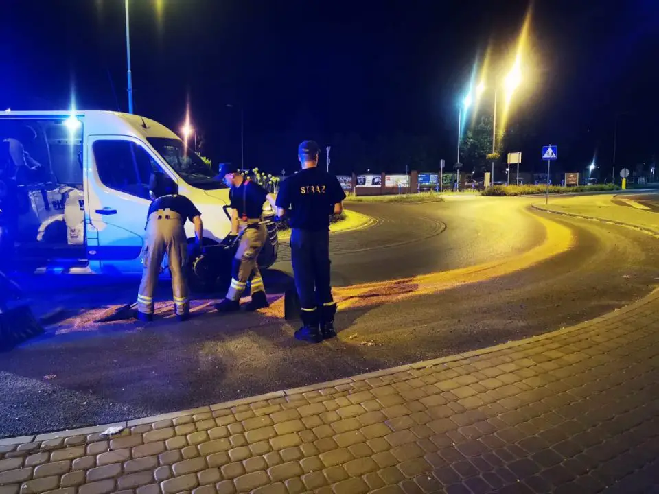 Na miejsce zdarzenia szybko dojechały wozy strażaków oraz policja. Rondo zostało zablokowane. Strażacy sprawnie zebrali drogi granulat z jezdni.