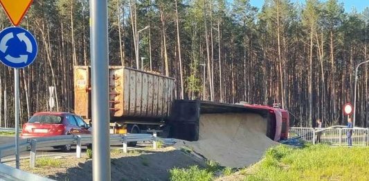 Ciężarówka przewróciła się na nowym rondzie obwodnicy południowej Zielonej Góry (ZDJĘCIA)