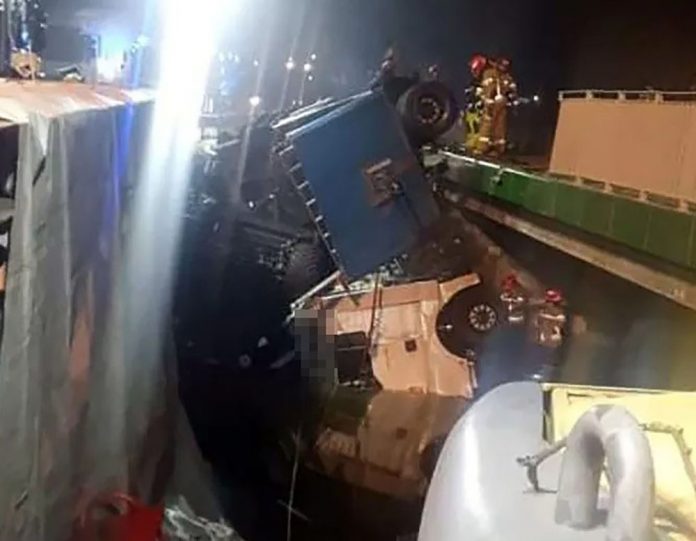 Do groźnego zdarzenia doszło we wtorek, 16 listopada, wieczorem na drodze krajowej nr 32 w miejscowości Kotowo koło Grodziska Wlkp. Ciężarówka przewożąca maszyny rolnicze spadłą z mostu do rzeki. Strat to około 1mlm zł.