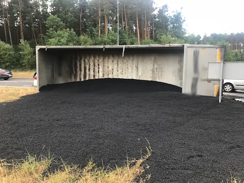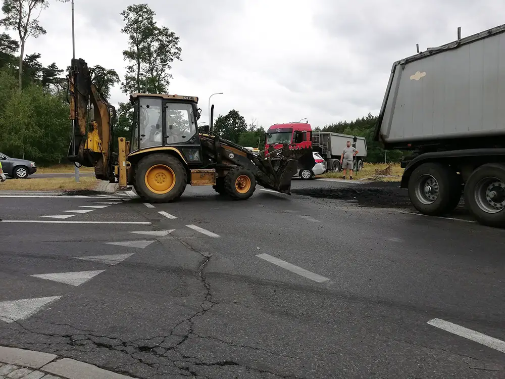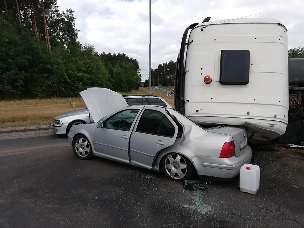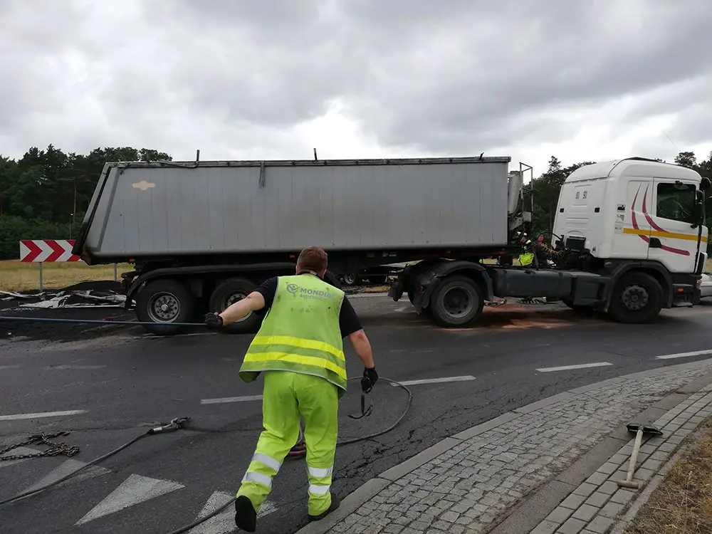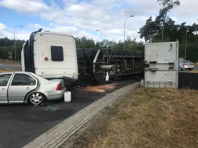 Ciężarówka upadła tak nieszczęśliwie, że przygniotła volkswagena borę. Na szczęście osobom jadącym osobówką nic się nie stało. Naczepa z asfaltem przewróciła się. Masa bitumiczna wysypała się na drogę i rondo.