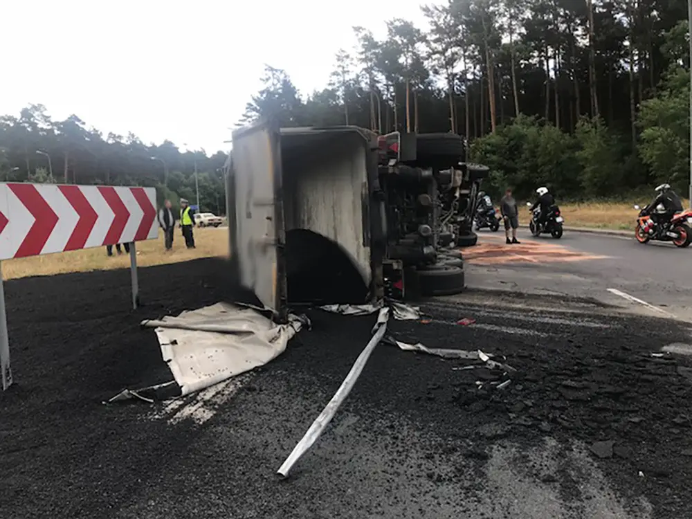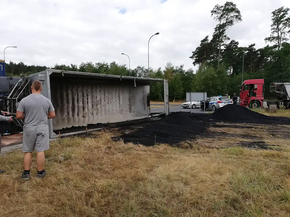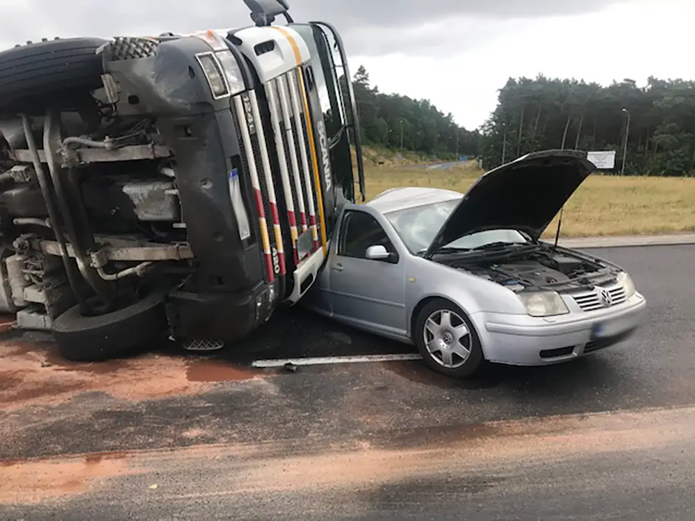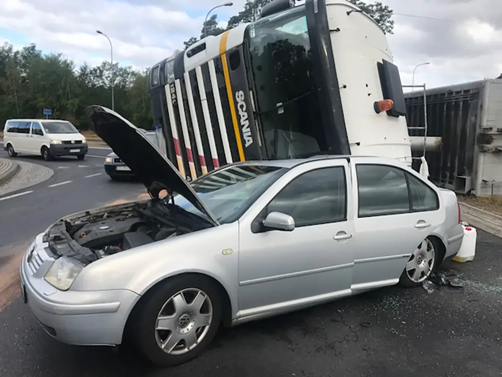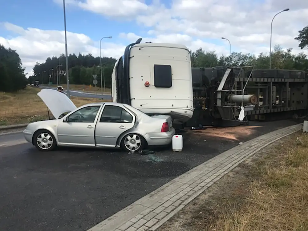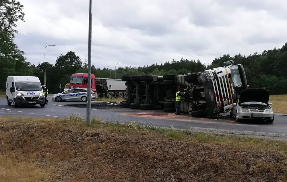 Do zdarzenia doszło z samego rana. Rondem Piastów Śląskich (wylot na Krosno Odrzańskie) jechały ciężarowa scania z ładunkiem asfaltu i volkswagen bora. – Ciężarówka najprawdopodobniej w wyniku zbyt szybkiej jazdy przewróciła się – mówi podinsp. Małgorzata Barska z biura prasowego zielonogórskiej policji.
