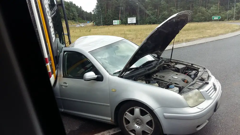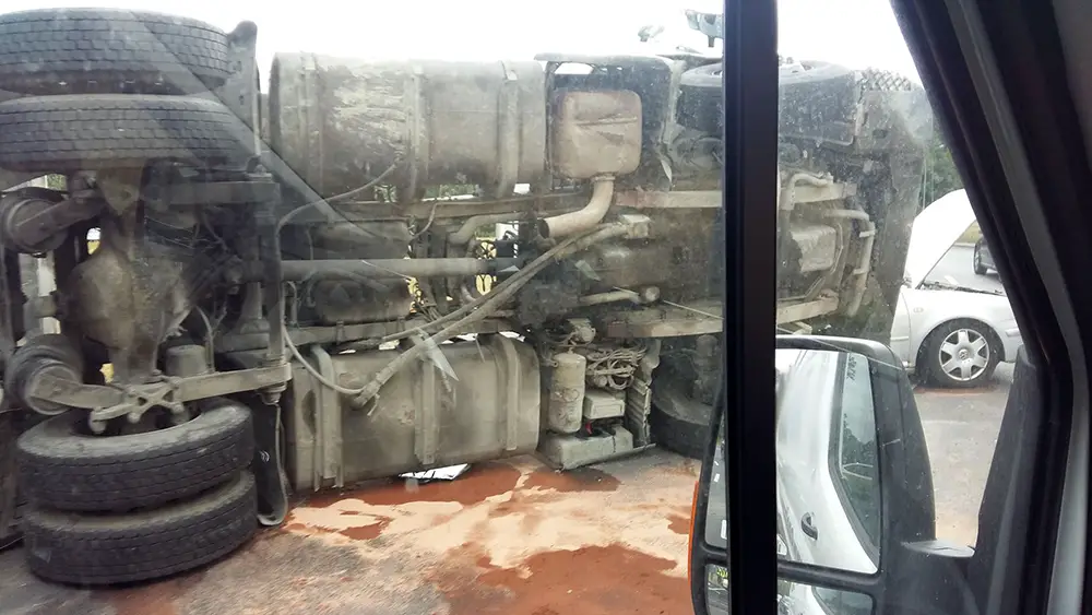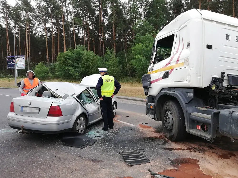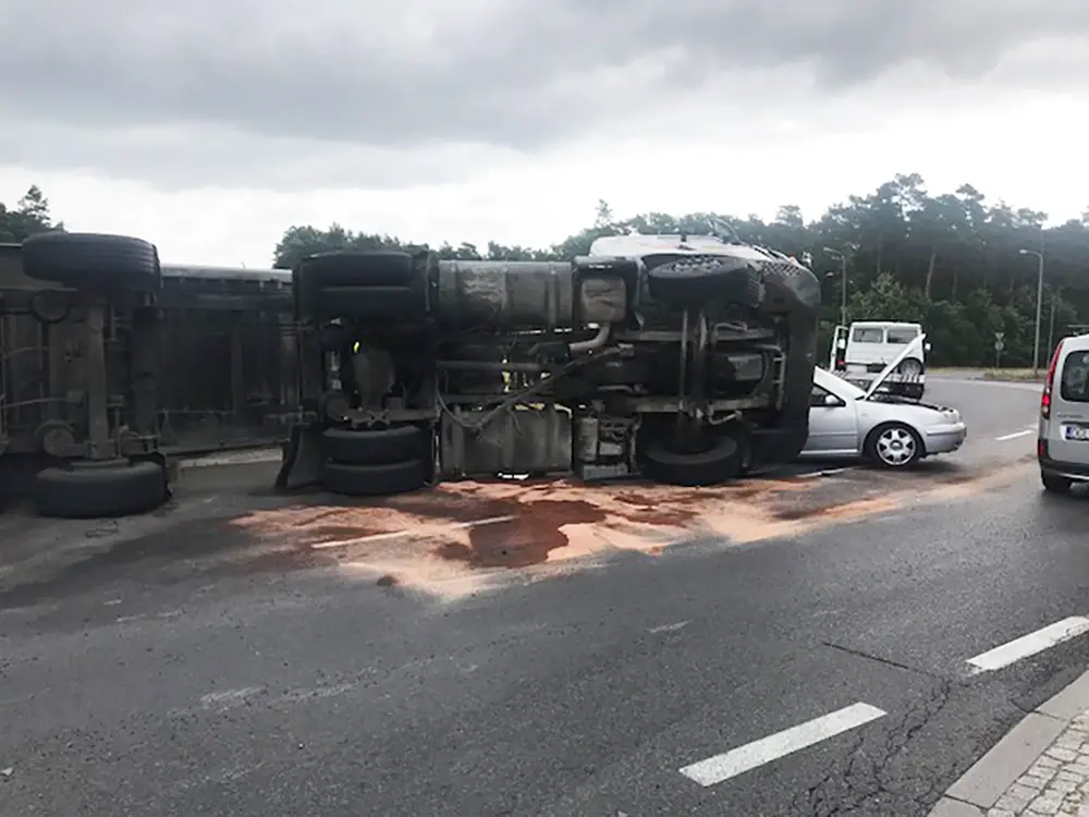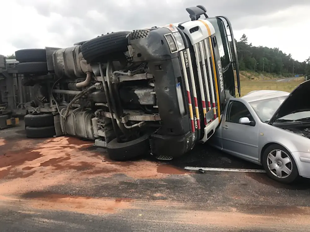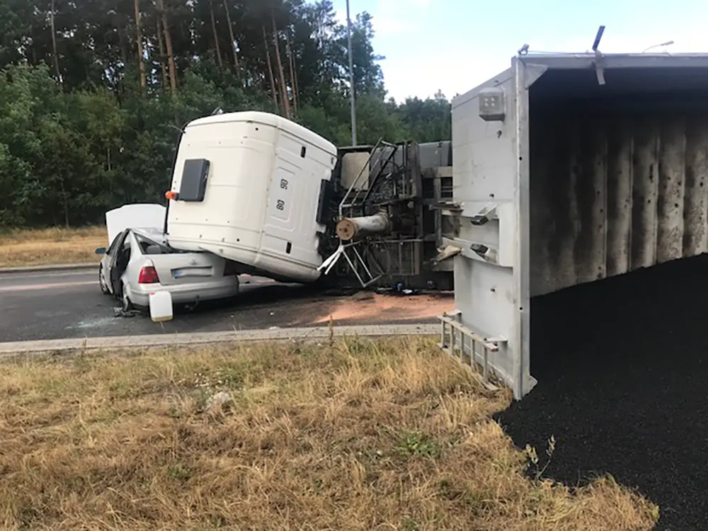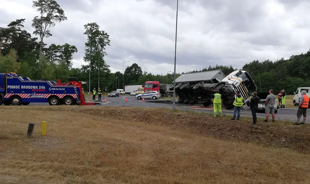 Do zdarzenia doszło z samego rana. Rondem Piastów Śląskich (wylot na Krosno Odrzańskie) jechały ciężarowa scania z ładunkiem asfaltu i volkswagen bora. – Ciężarówka najprawdopodobniej w wyniku zbyt szybkiej jazdy przewróciła się – mówi podinsp. Małgorzata Barska z biura prasowego zielonogórskiej policji.