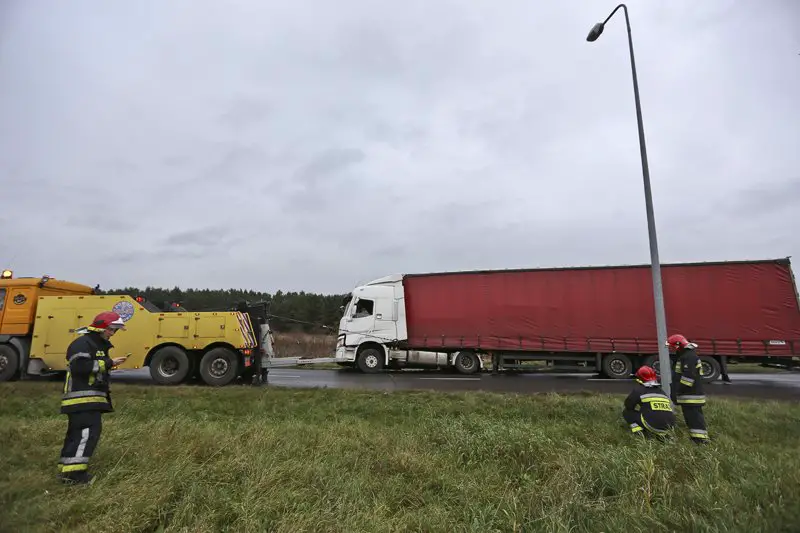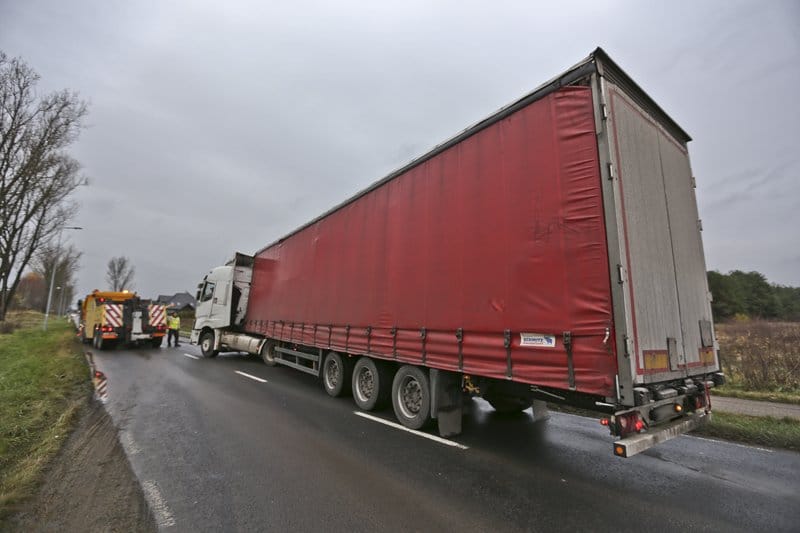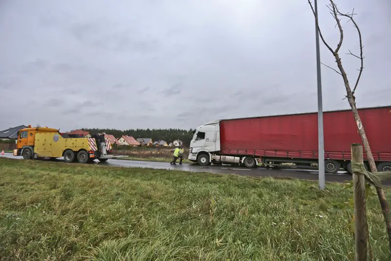 Kierowca wyładowanej ciężarówki wjeżdżał na ul. Odrzańską. Chciał jechać w kierunku Łężycy. Zakręcając wypadł jednak z pobocza. Koła osunęły się na poboczu i ciężarówka utknęła lekko przechylona. Samochód zablokował przejazd w obu kierunkach.