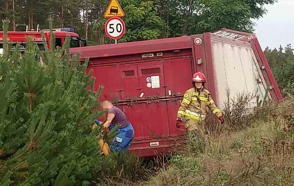 Godz. 14.12 Na miejscu jest już dźwig. Trwa podnoszenie przewróconej ciężarówki z pobocza.