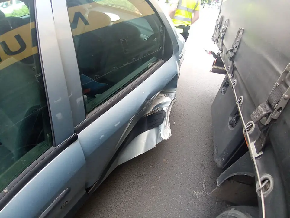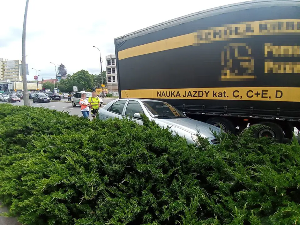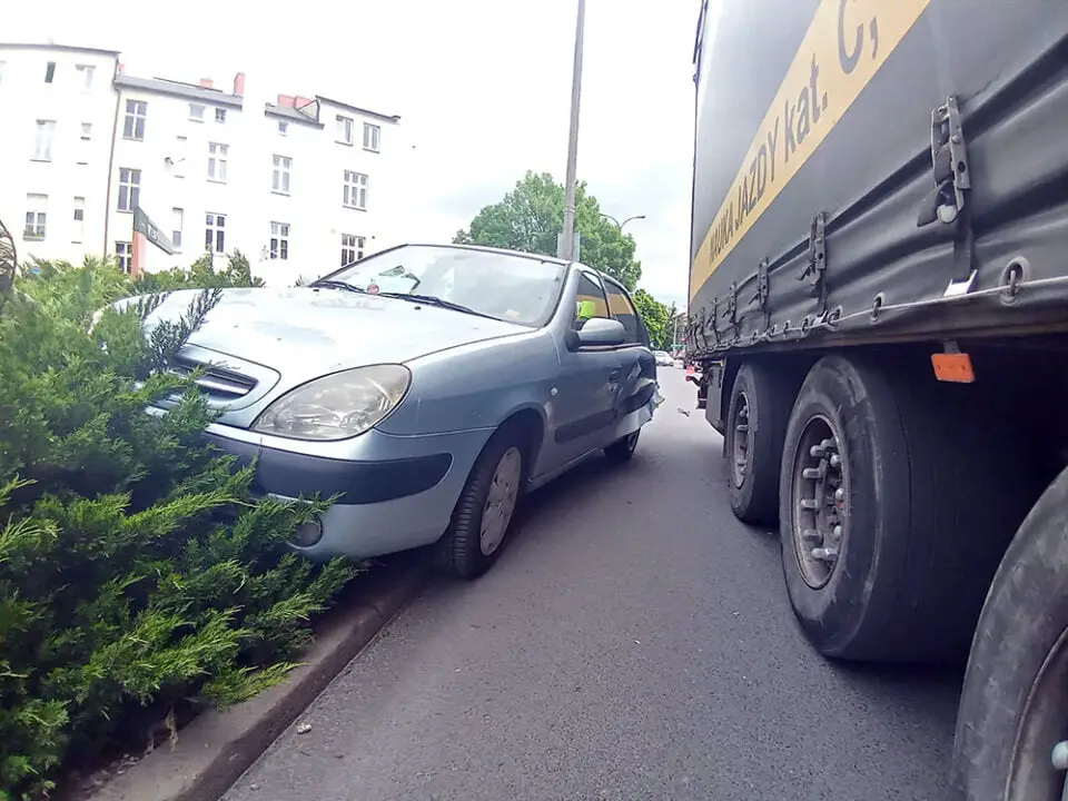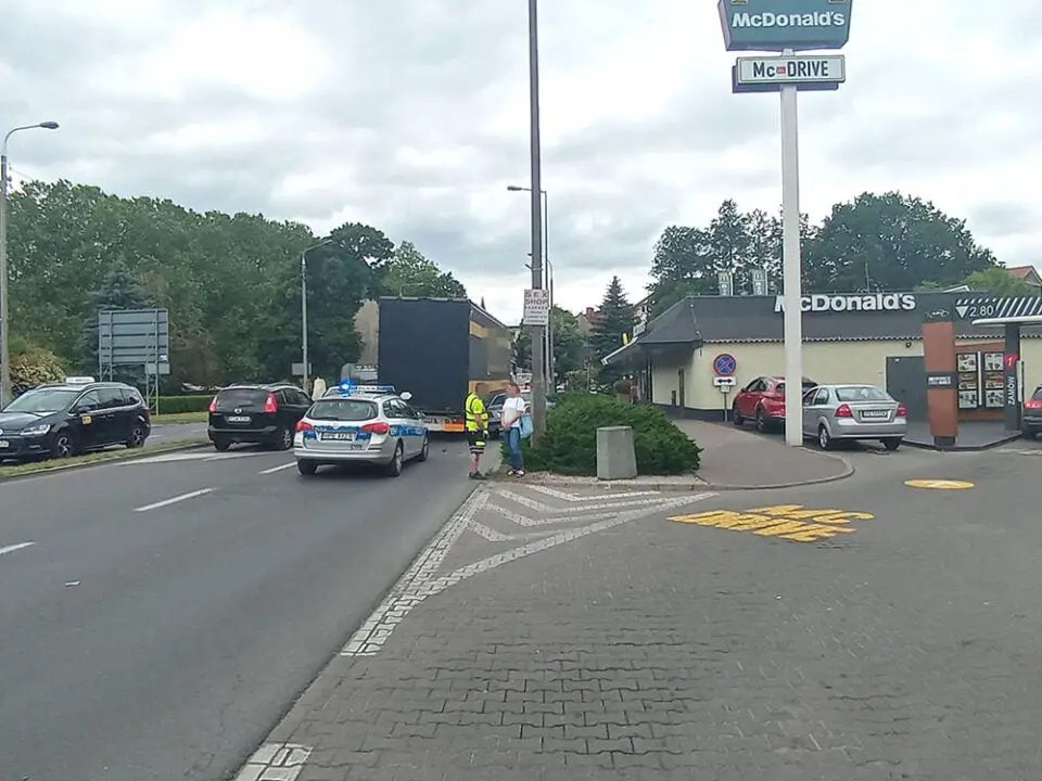 Kierujący ciężarówką jechał ul. Wybickiego. Koło restauracji Mc Donald’s kończył mu się pas, dlatego zjechał na lewo. Wtedy uderzył bokiem w jadącego prawidłowo citroena spychając go z drogi. Mimo groźnie wyglądającego zdarzenia, na szczęście nikomu nic się nie stało. Na miejsce została wezwana gorzowska policja. Zdarzenia zostało zakwalifikowane jako kolizja.