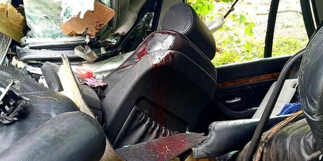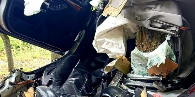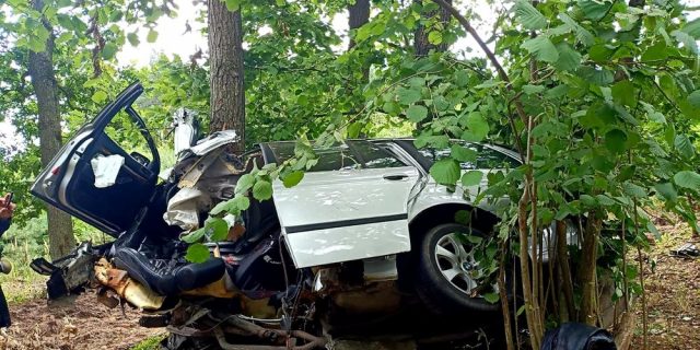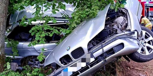 Bmw wypadło z drogi i z potężną siłą uderzyło w drzewo. Uderzenie było tak wielkie, że bmw odwinęło się na drzewie.