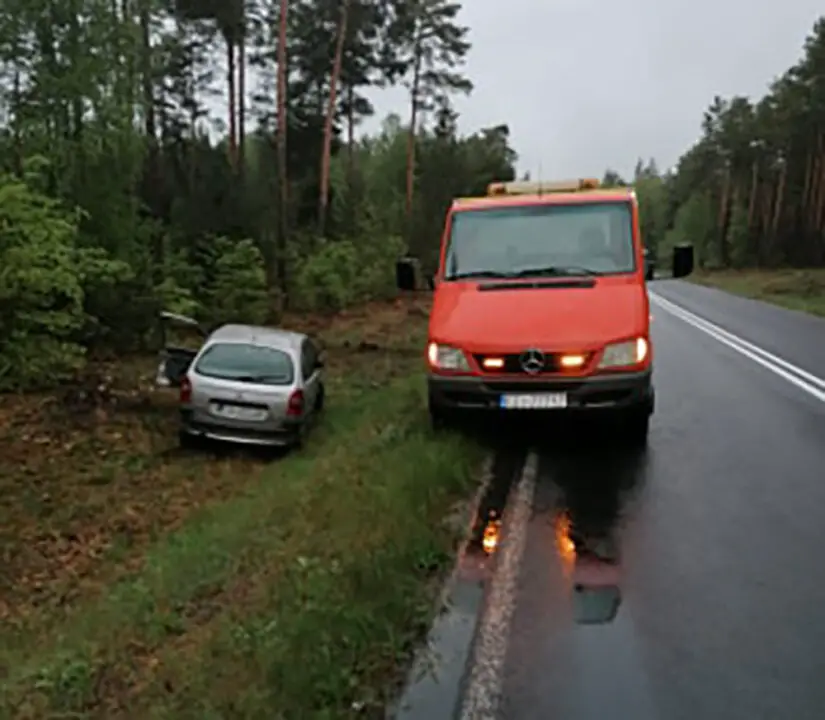 Kierująca citroenem podczas jazdy wpadła w poślizg i straciła panowanie nad kierownicą. Samochód wypadł z drogi do rowu. Na miejsce zdarzenia przyjechała pomoc drogowa, która szybko wyciągnęła samochód z pobocza. Na szczęście kierującej nic się nie stało.