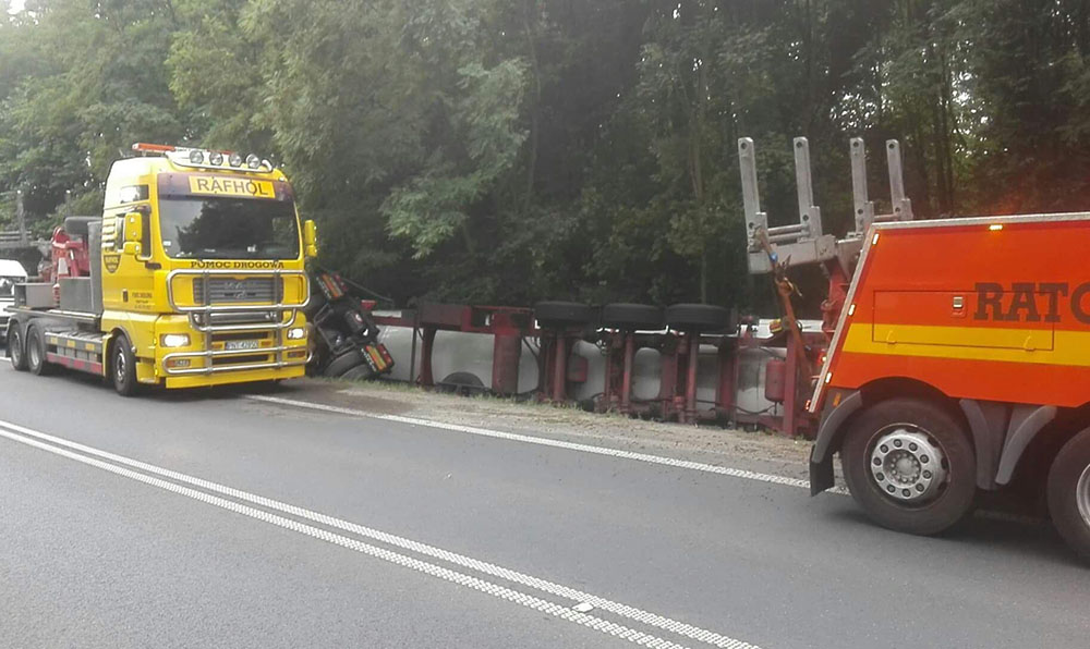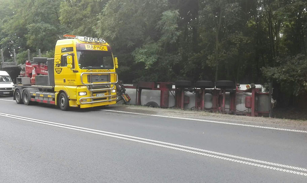 Do zdarzenia doszło we wtorek, 17 lipca, na trasie koło Pniew. Cysterna jechała ze Skwierzyny. Trwa podnoszenie ogromnej ciężarówki.