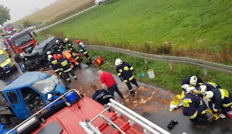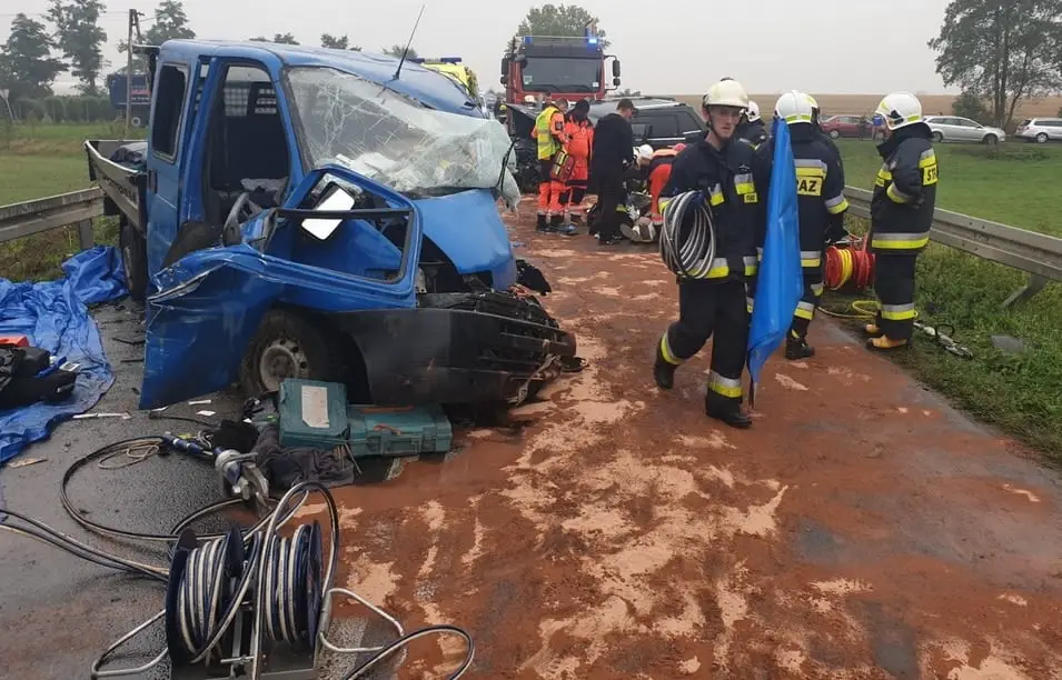 Kierujący jeepem 71-latek z niewyjaśnionych jeszcze przyczyn zjechał na przeciwległy pas ruchu i tam zderzył się czołowo z peugeotem busem. Za kierownicą peugeota siedział 35-latek. W rozbitym busie uwięzione zostały cztery osoby, dwie kolejne były w jeepie. Na pomoc poszkodowanym wyruszyły dwa zastępy ratownicze z pleszewskiej jednostki, trzy z ochotniczych straży pożarny z Broniszewic, Czermina i Pleszewa oraz zespoły ratownictwa medycznego i policja.