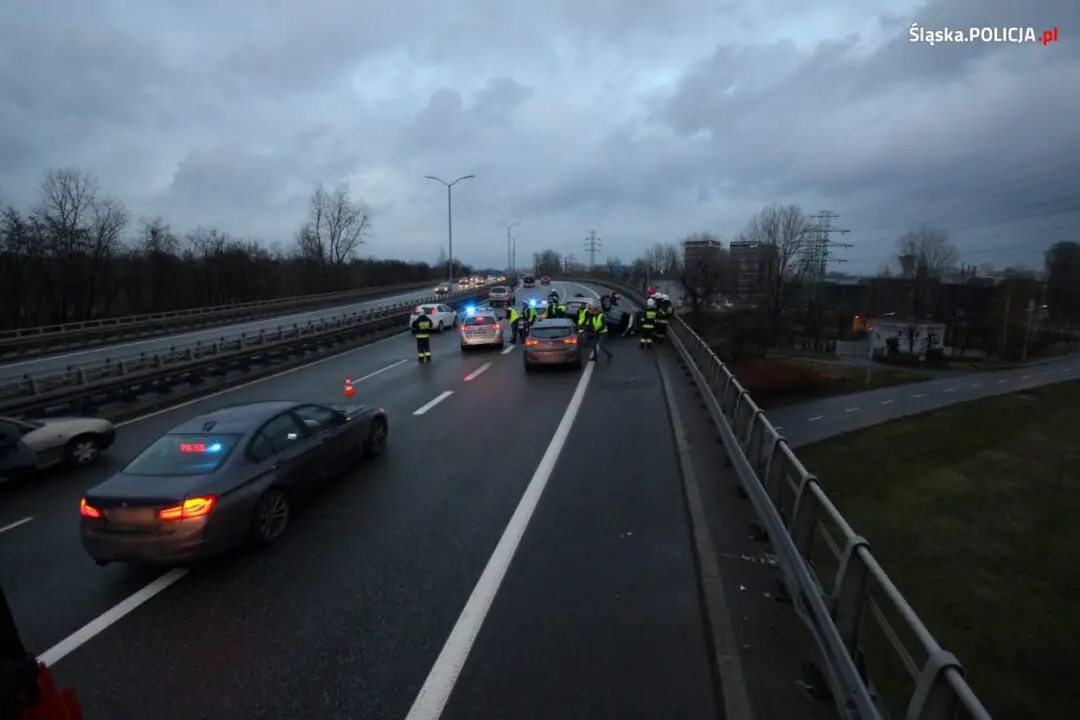 Do wypadku doszło na katowickim odcinku DTŚ na wysokości ul. Brackiej zjazd w ul. Chorzowską. W wyniku zdarzenia kierujący radiowozem policjant z garnizonu małopolskiego został ranny i trafił do szpitala. Jego życiu nie zagraża niebezpieczeństwo.