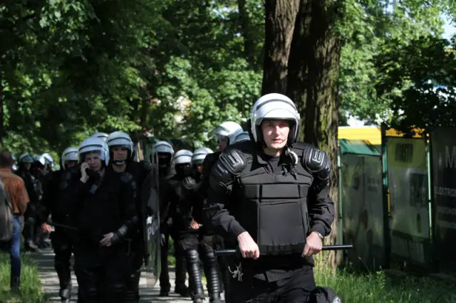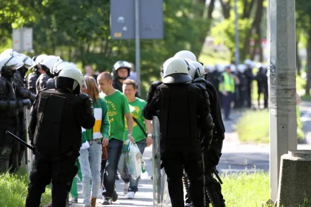 Wzdłuż ul. Wrocławskiej stała policja w pełnym szturmowym umundurowaniu. Była drużyna z bronią gładkolufową raz miotacze gazu. W zabezpieczeniu meczu wykorzystano czternaście policyjnych psów. – Siłę policji było widać – mówili ludzie przechodzący obok. – Nie było problemów. Wystawiliśmy jedynie mandaty porządkowe za zakłócanie porządku – mówi podkom. Maciej Sałek, p.o. zastępcy komendanta zielonogórskiej policji.