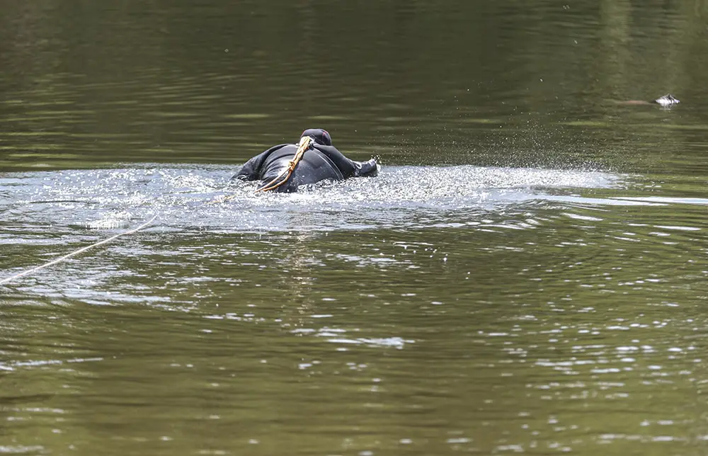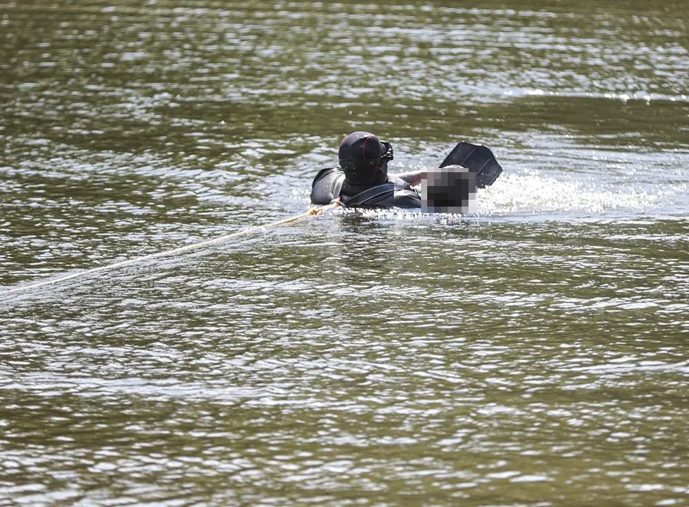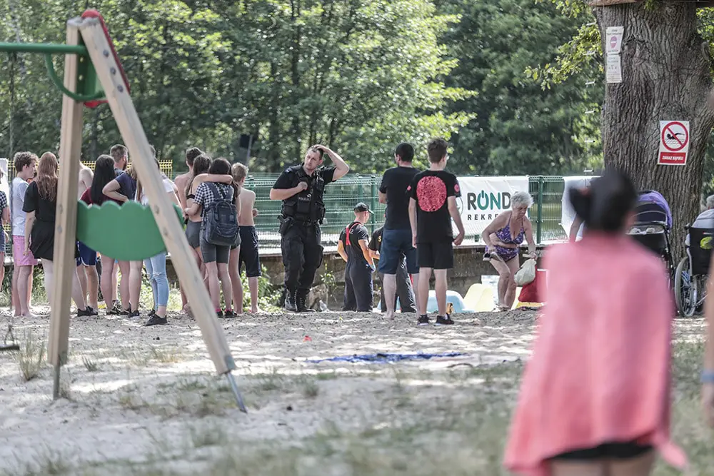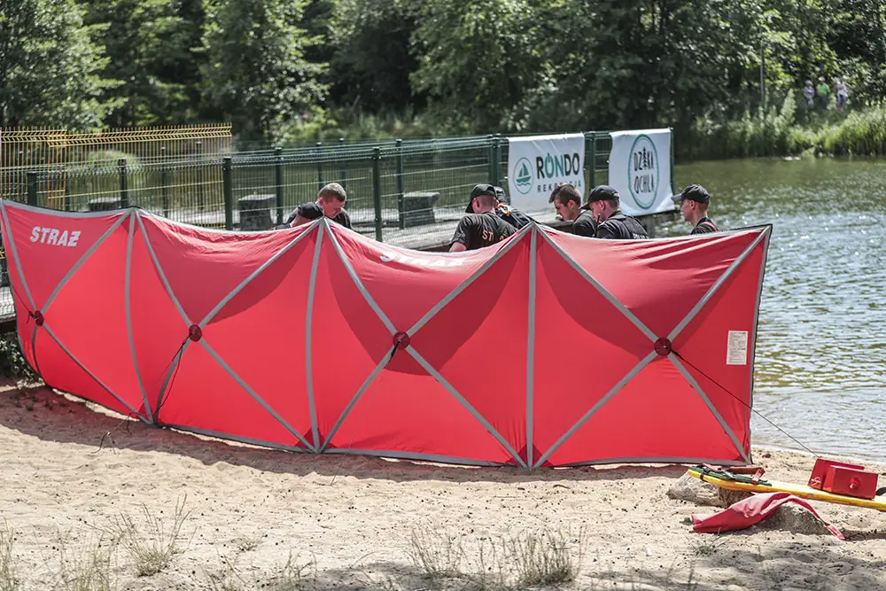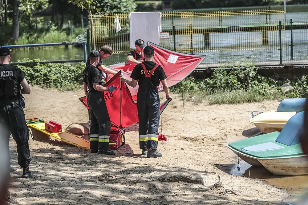 Na miejsce została wezwana policja oraz straż pożarna. Plaża natychmiast została odcięta dla ludzi. Teren odgrodzono taśmą. Kiedy strażacy rozkładali parawan, jeden z nich ubrał się w strój płetwonurka. Po chwili wszedł do wody.
