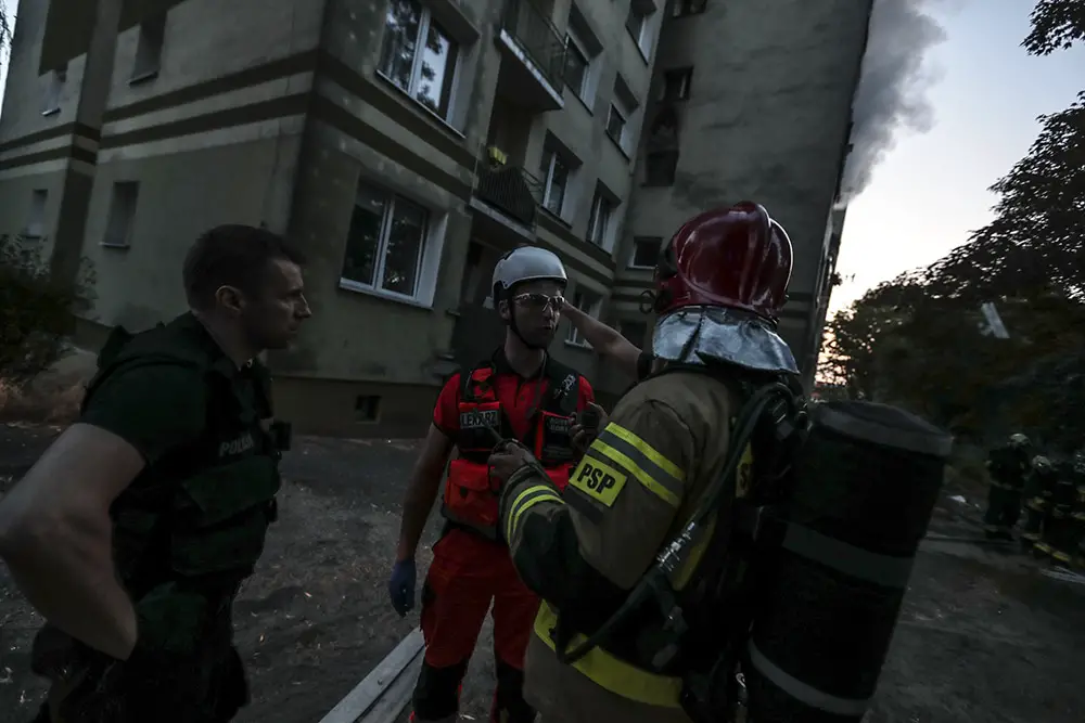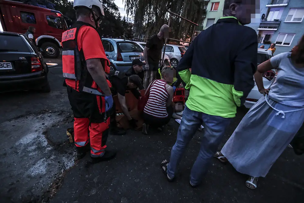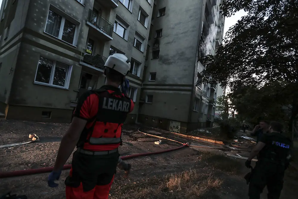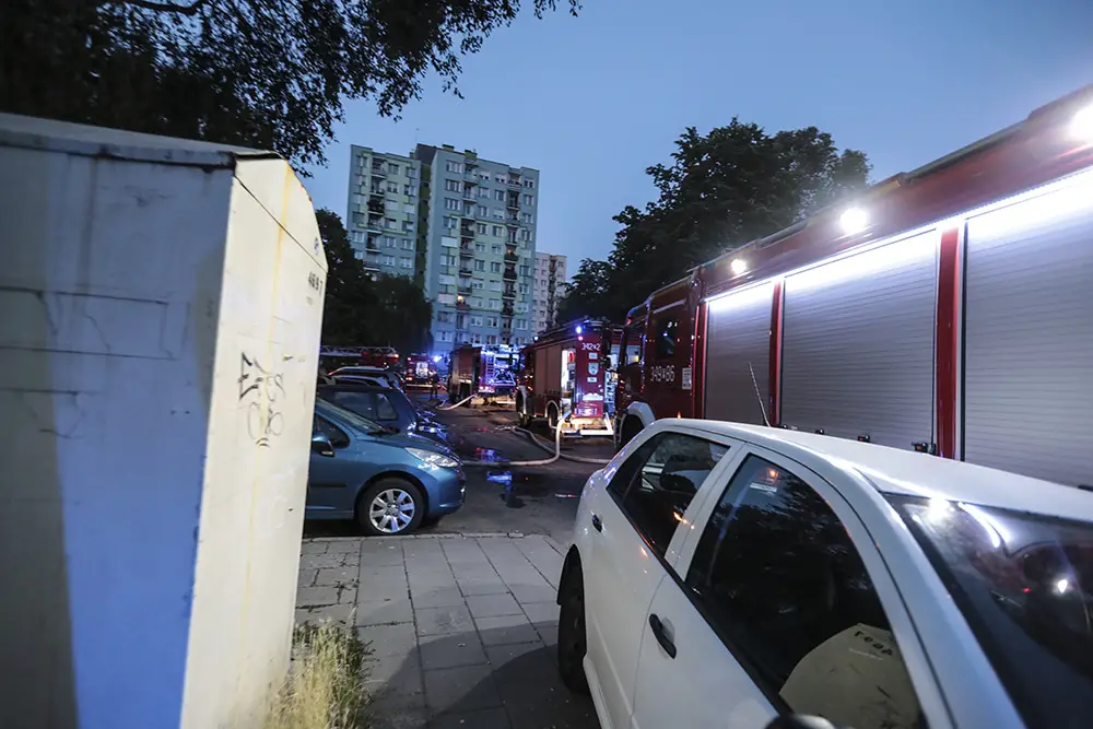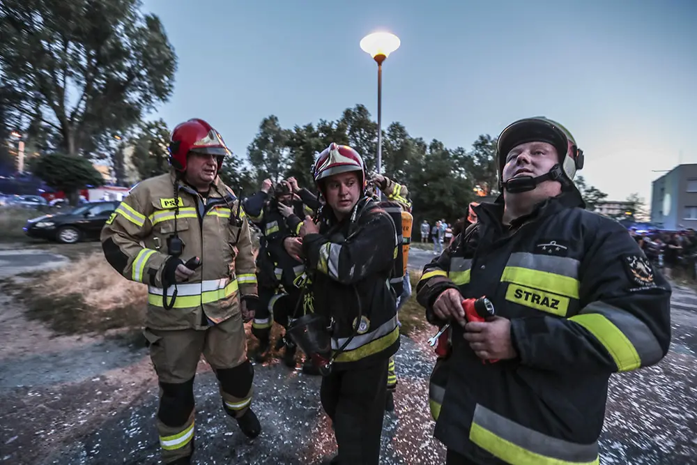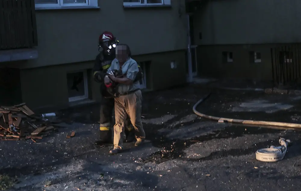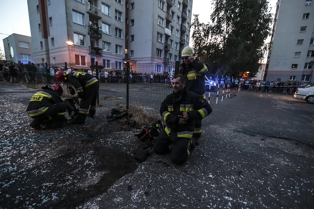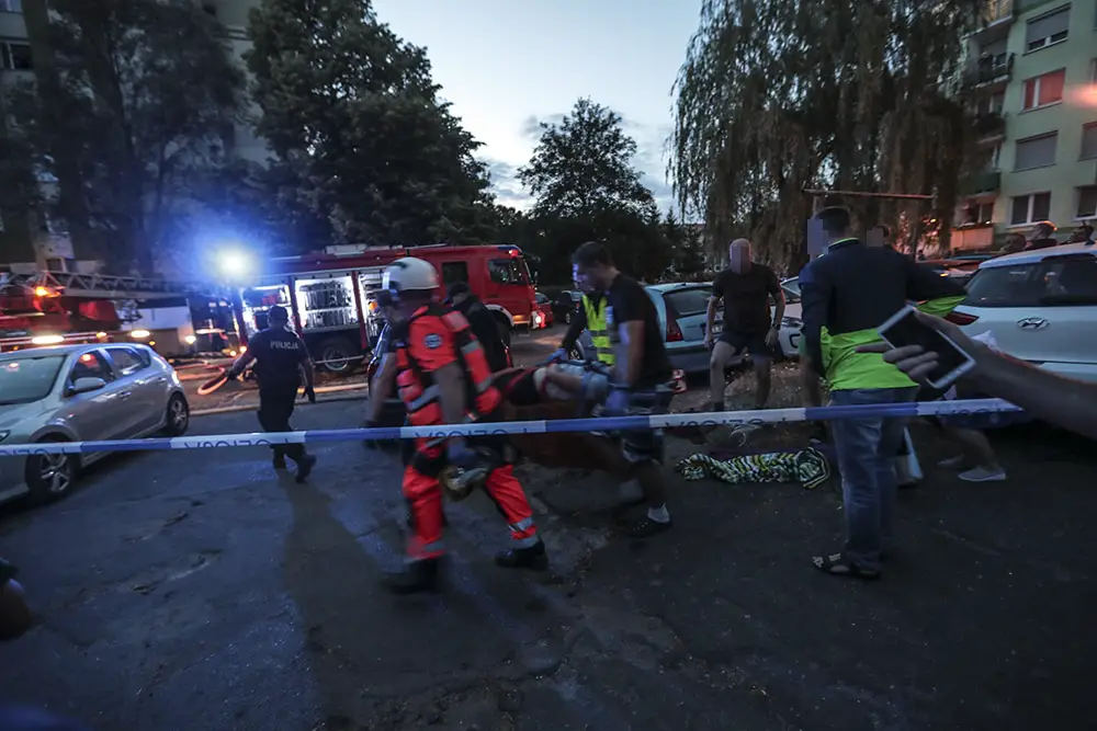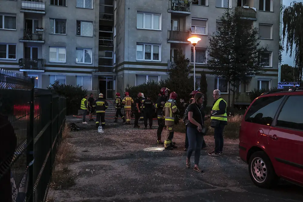 Na miejscu natychmiast przyjechały służby ratunkowe. Strażacy zaczęli gasić pożar w mieszkaniu na drugim piętrze wieżowca. Strażacy oraz ekipy pogotowia ratunkowego przeszukiwały wieżowiec i razem z policjantami wyprowadzali zdezorientowanych i wystraszonych mieszkańców. Było niebezpiecznie. Z okien co jakiś czas spadały szyby. Z mieszkania, w którym doszło do wybuchu, wydobywał się gęsty dym. Widać było również zniszczenia po wybuchu klatce schodowej. Okna oraz części ścian mieszkania, w którym doszło do wybuchu wyleciały kilkadziesiąt metrów dalej.