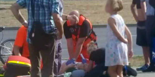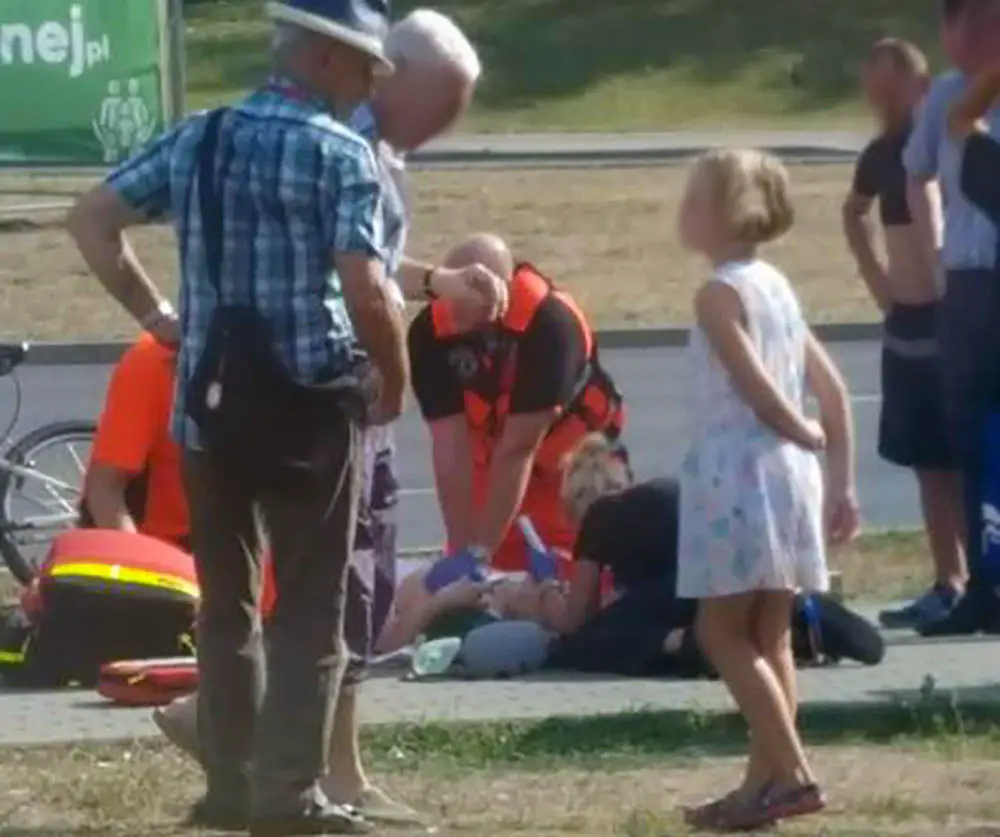 Kobieta była nieprzytomna. Pomocy udzielali jej Ł. Markiewicz oraz inne osoby. Na miejsce zostało wezwane pogotowie ratunkowe. Na chodniku kobieta była długo reanimowana. Po pewnym czasie karetka na sygnałach odjechała z kobietą do szpitala.