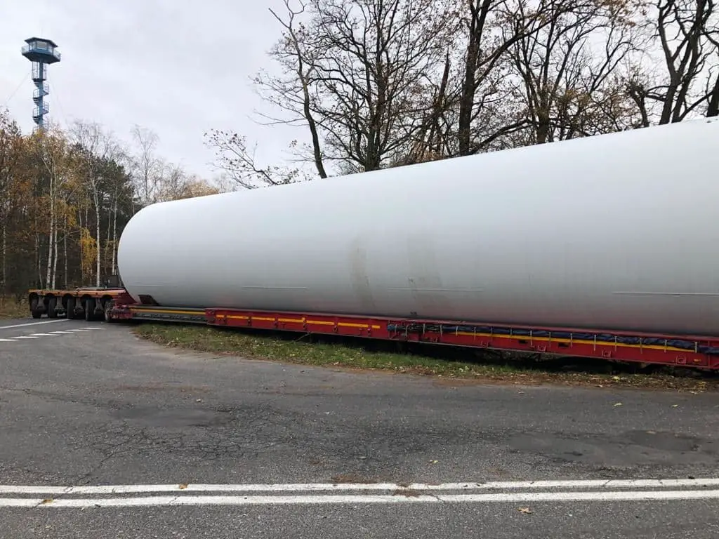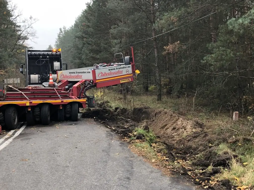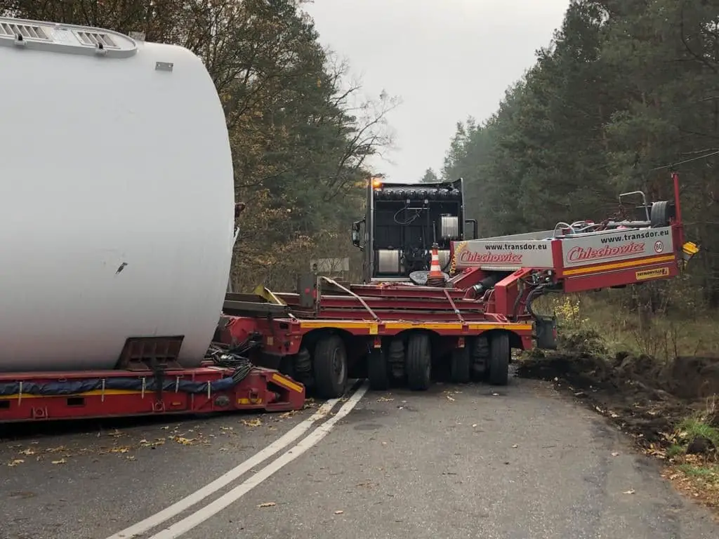 Kierowca na specjalnej platformie przewoził rurę do wiatraka. To ponadgabarytowy element. Najprawdopodobniej źle ocenił miejsce na drodze i podczas skrętu naczepa „złamała się” i w rezultacie zablokowała. Droga została zablokowana w obu kierunkach.Na miejsce pojechała zielonogórska policja. Od razu ruszyła akcja odblokowywania drogi. Udało się to dopiero około godz. 18.00. Po niemal 12 godzinach droga jest już przejezdna. Element pojechał do Trojanówki gdzie jest budowany wiatrak.