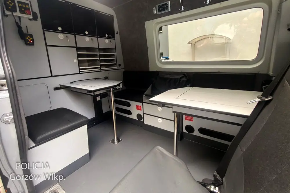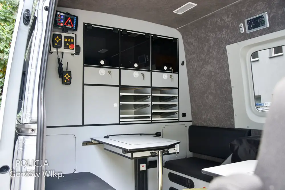 W radiowozie znajdują się biurka, sprzęt informatyczny, miejsce na niezbędną dokumentację. Samochód jest komfortowy i bezpieczny, bo spełnia dzisiejsze standardy. Radiowóz jest wykorzystywany przez gorzowskich policjantów ruchu drogowego.