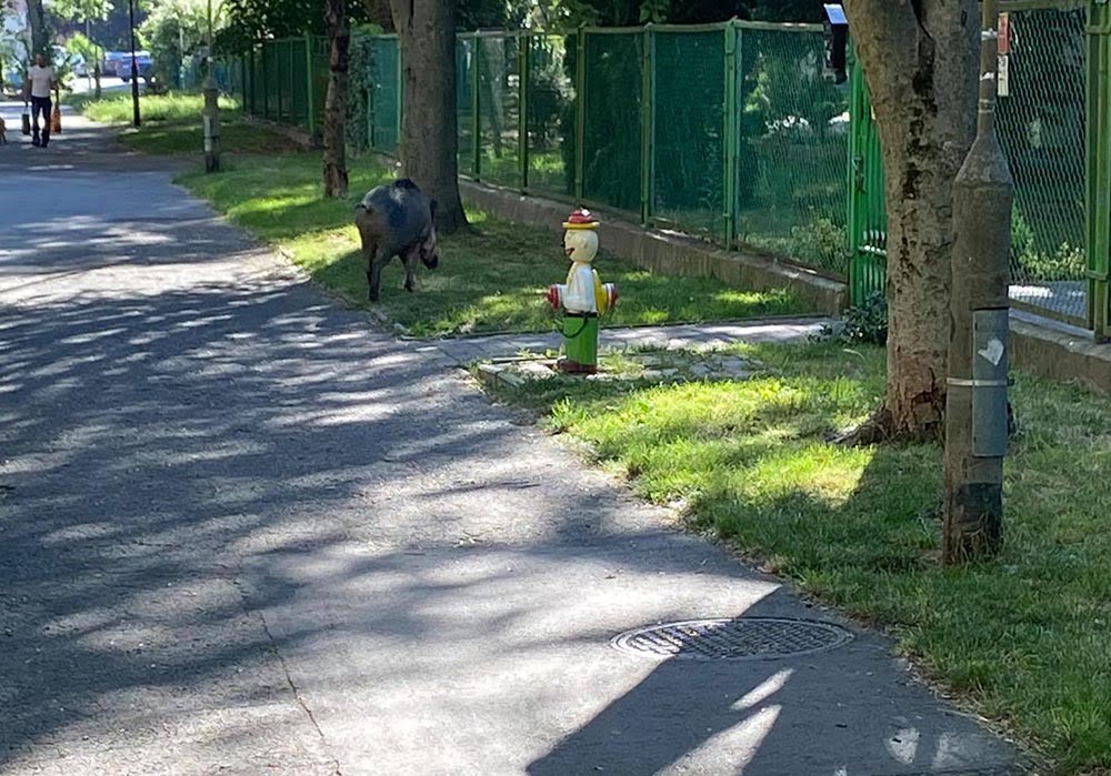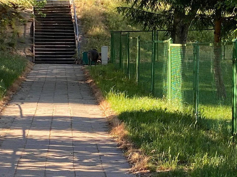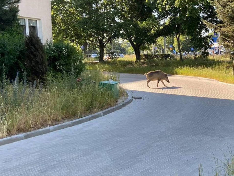 Duży dzik pojawił się w poniedziałek, 15 czerwca, z samego rana na ul. Wyszyńskiego. Chodził po krzakach, po chodnikach i między blokami.