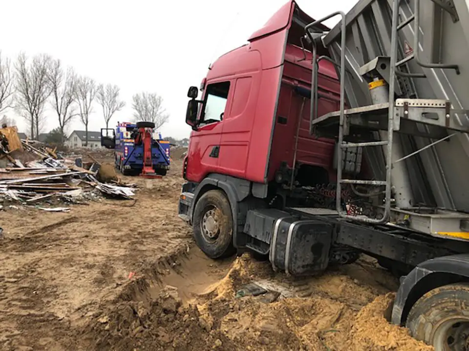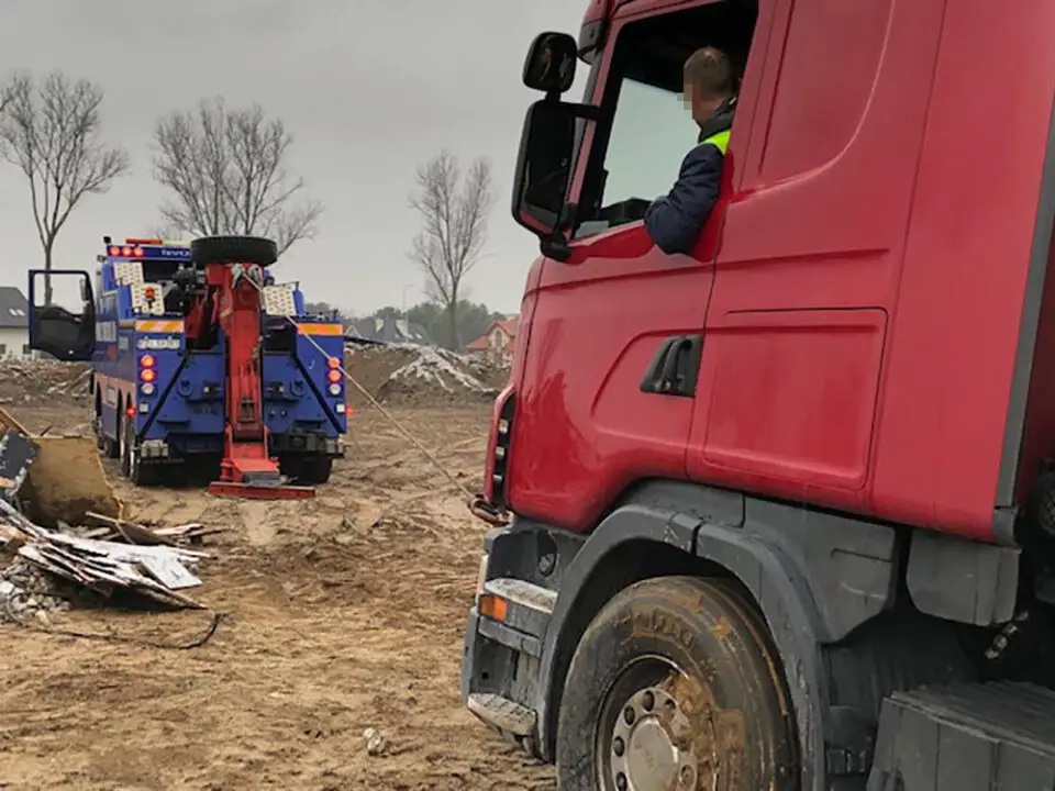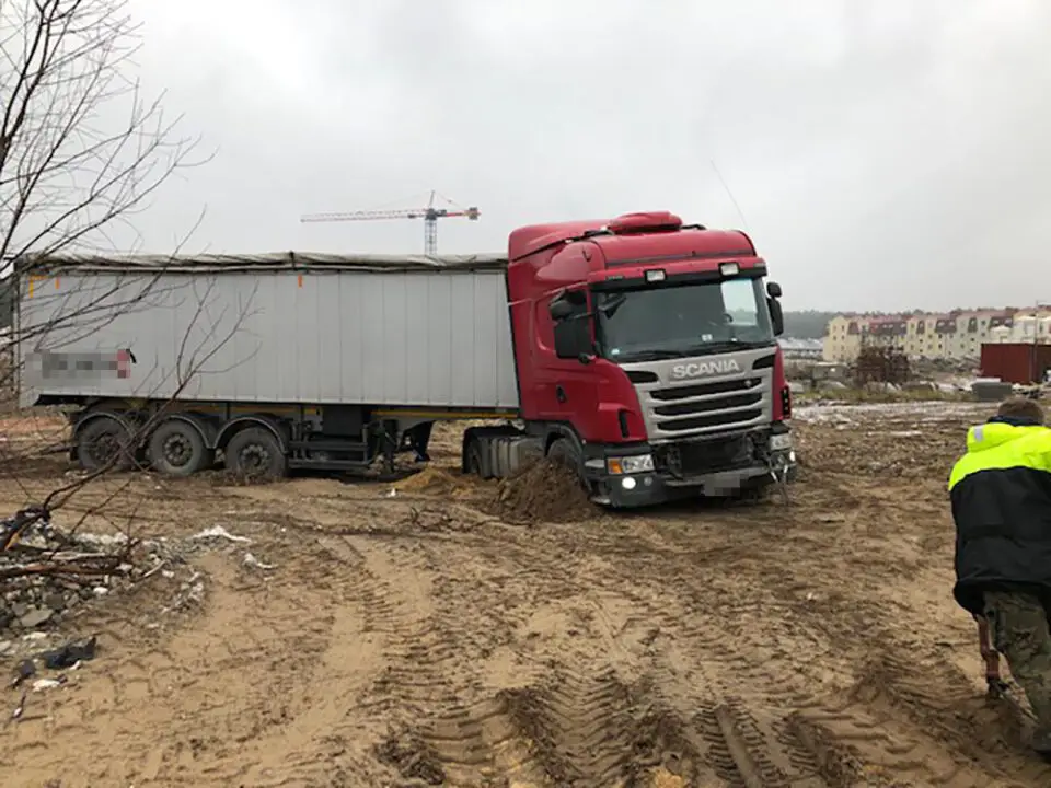 Kierowca pierwszej ciężarówki wjechał na plac budowy na Czarkowie. Niestety, ciężki pojazd ugrzązł i zakopał się w miękkim piachu. Kierowca nie mógł wyjechać. Konieczna była interwencja pomocy drogowej. – Wyciągnęliśmy ciężarówkę i kierowca odjechał – mówi Marek Dziubałka z pomocy drogowej Maxmar.