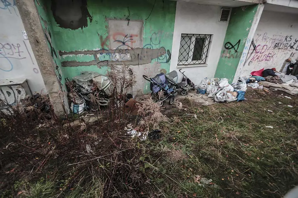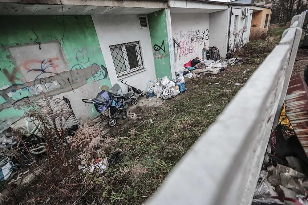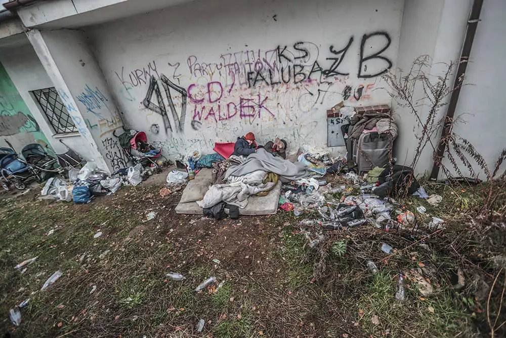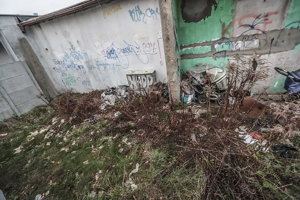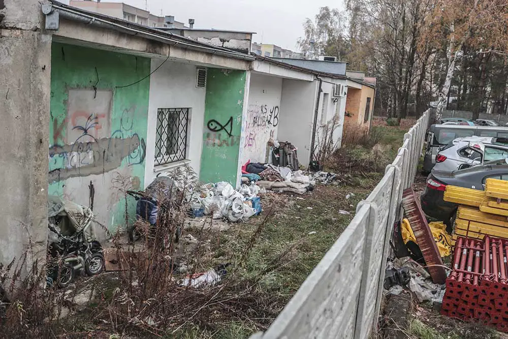 W piątek, 23 listopada, pojechaliśmy na tyły lokali przy ul. Rzeźniczaka. Za betonowym płotem, na niewielkim podwórku, dzikie legowisko urządziła sobie para bezdomnych. Spali w stercie ubrań. Obok stały wózki, na których wozili swój dobytek oraz to, co mogli sprzedać. – Cały czas nocami są pijani. Próbowali już rozpalać ogniska – mówi nam osoba, która zauważyła bezdomnych.