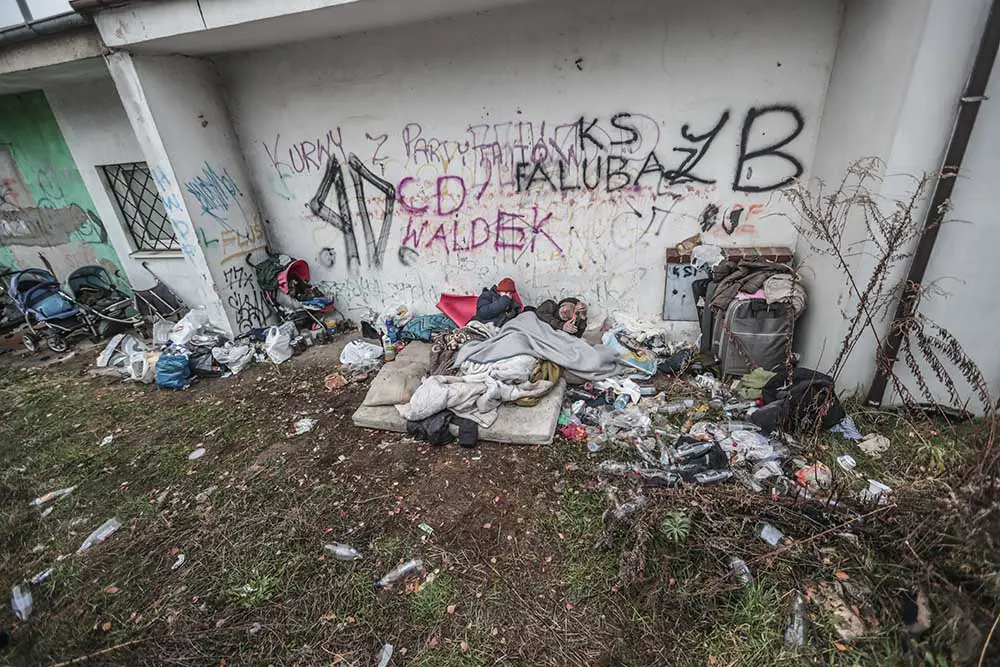 Para bezdomnych urządziła sobie dzikie legowisko na tyłach lokali przy ul. Rzeźniczaka. Pili tam denaturat. Nie reagowali na prośby ludzi namawiających ich do udania się do noclegowni. Interweniowała policja.