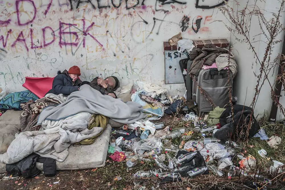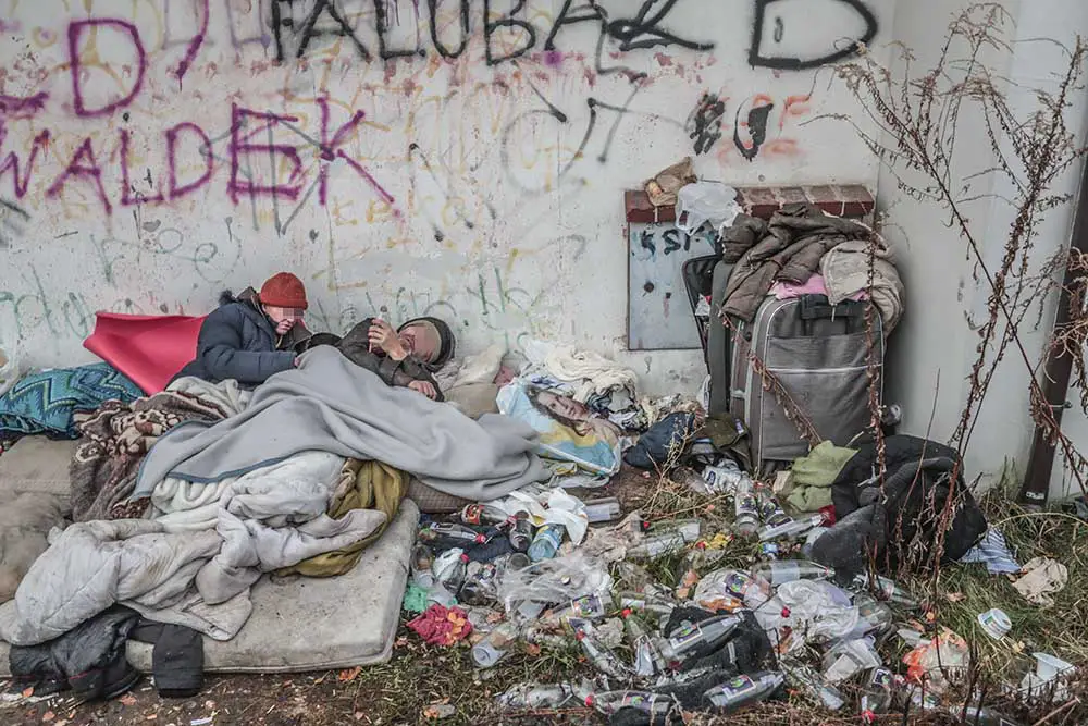 Pod stertą ubrań była kobieta z mężczyzną. Pili denaturat. Nie chcieli rozmawiać. – Możecie tutaj zamarznąć – mówiliśmy. Nie reagowali. Mężczyzna popijał z butelki denaturat. Podawał butelkę kobiecie. Ona również piła.