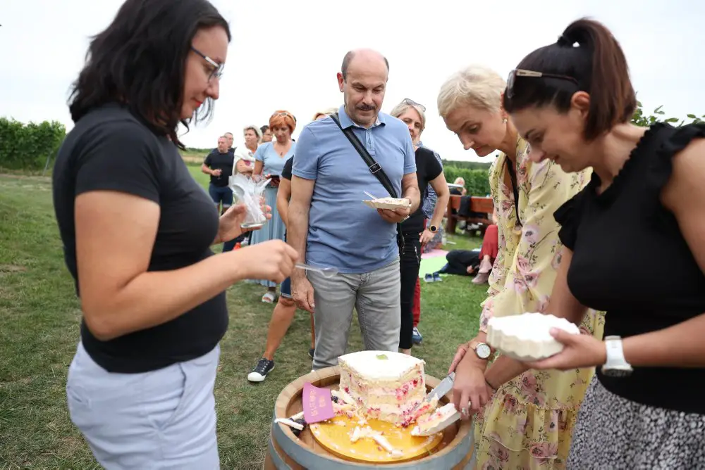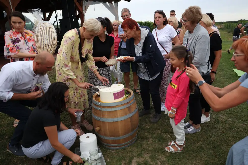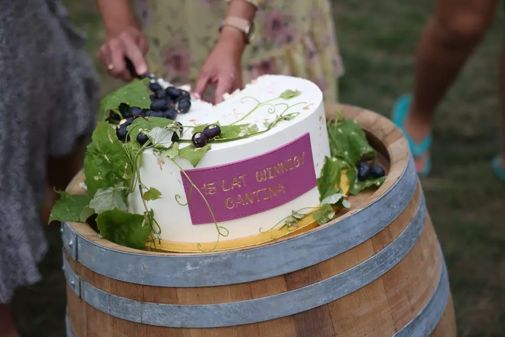 Przepyszny tort okazji 15. urodzin Canitny zniknął dosłownie w chwilę. Potem były życzenia, również od zaprzyjaźnionych winiarzy. Po słodkości ustawiła się długa kolejka. Potem do późnej nocy były degustacje wina i dobra zabawa.