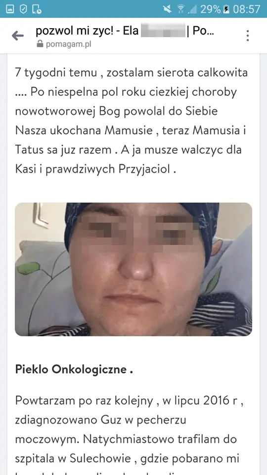 Nie wiadomo czy Ela działała sama. Była przy niej cały czas siostra i kilka innych osób. Siostra nie odpowiedziała na pytanie, czy brała pieniądze ze zbiórek. Ela i jej siostra Katarzyna usunęły swoje konta na facebooku.