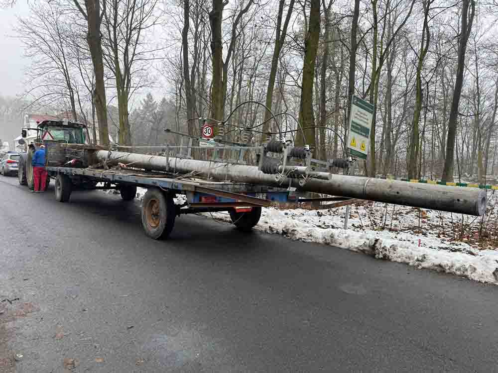 W poniedziałek,1 grudnia, w regionie leszczyńskim panowała mgła, a na drogach było ślisko. Na wjeździe do Leszna od strony Gostynia, na drodze krajowej nr 12, uwagę policjantów drogówki zwrócił ciągnik rolniczy z naczepą, na której przewożony był kilkumetrowy, betonowy słup energetyczny.