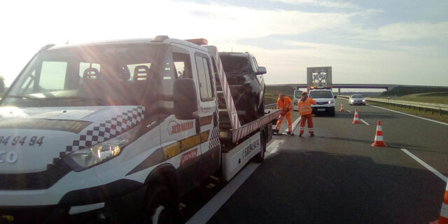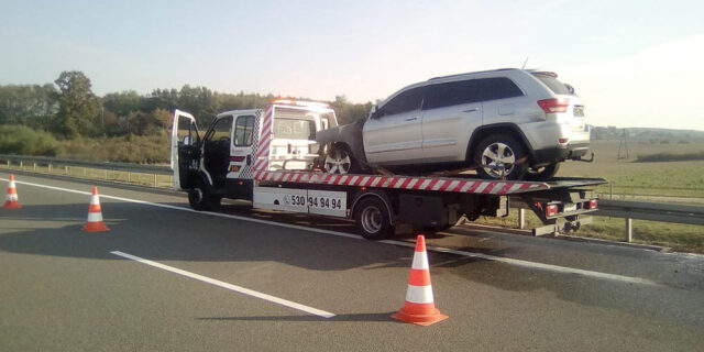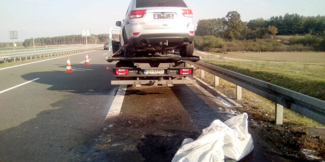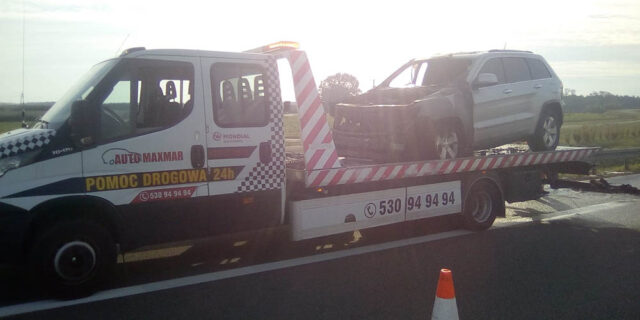 Przód samochodu oraz częściowo wnętrze spłonęły doszczętnie. Samochód nadaje się już tylko na złom. Spalonego jeepa z S3 odholowała pomoc drogowa Maxmar z Zielonej Góry.