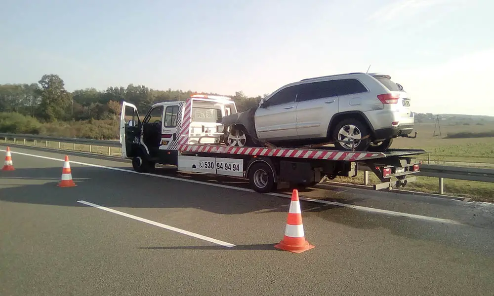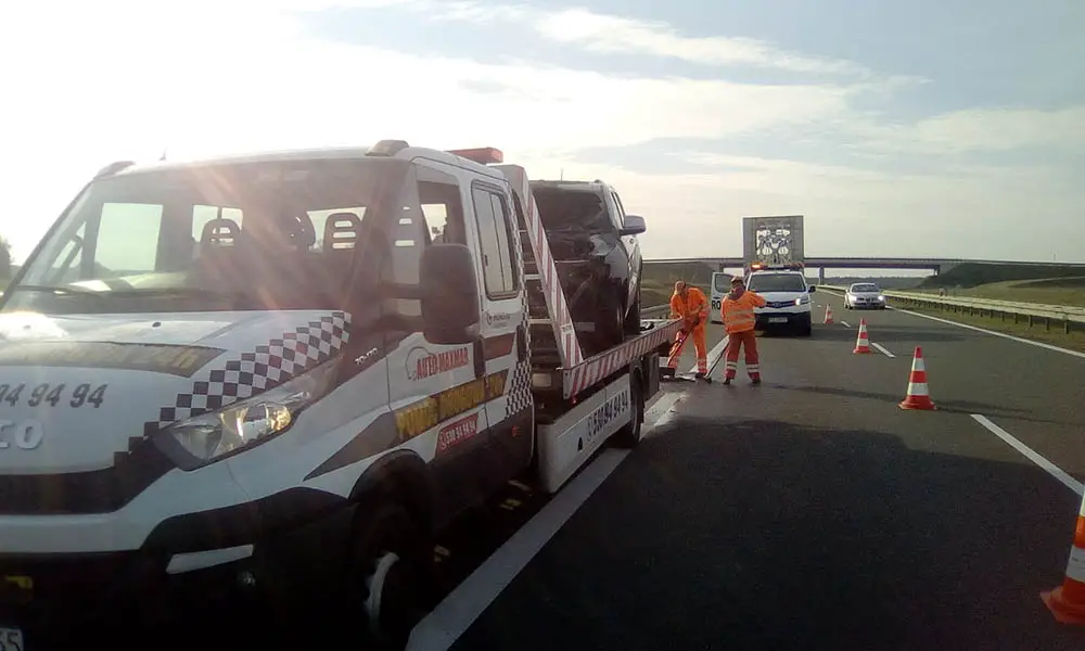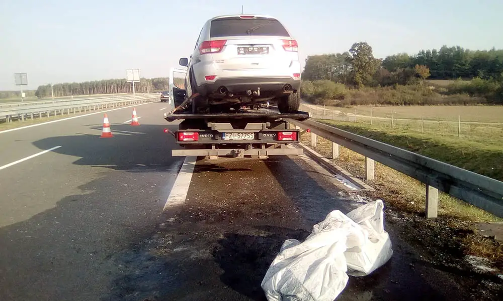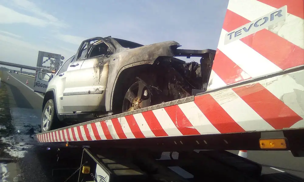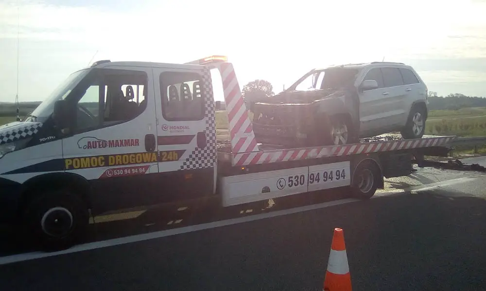 Przód samochodu oraz częściowo wnętrze spłonęły doszczętnie. Samochód nadaje się już tylko na złom. Spalonego jeepa z S3 odholowała pomoc drogowa Maxmar z Zielonej Góry.
